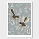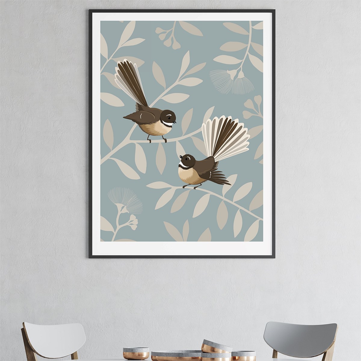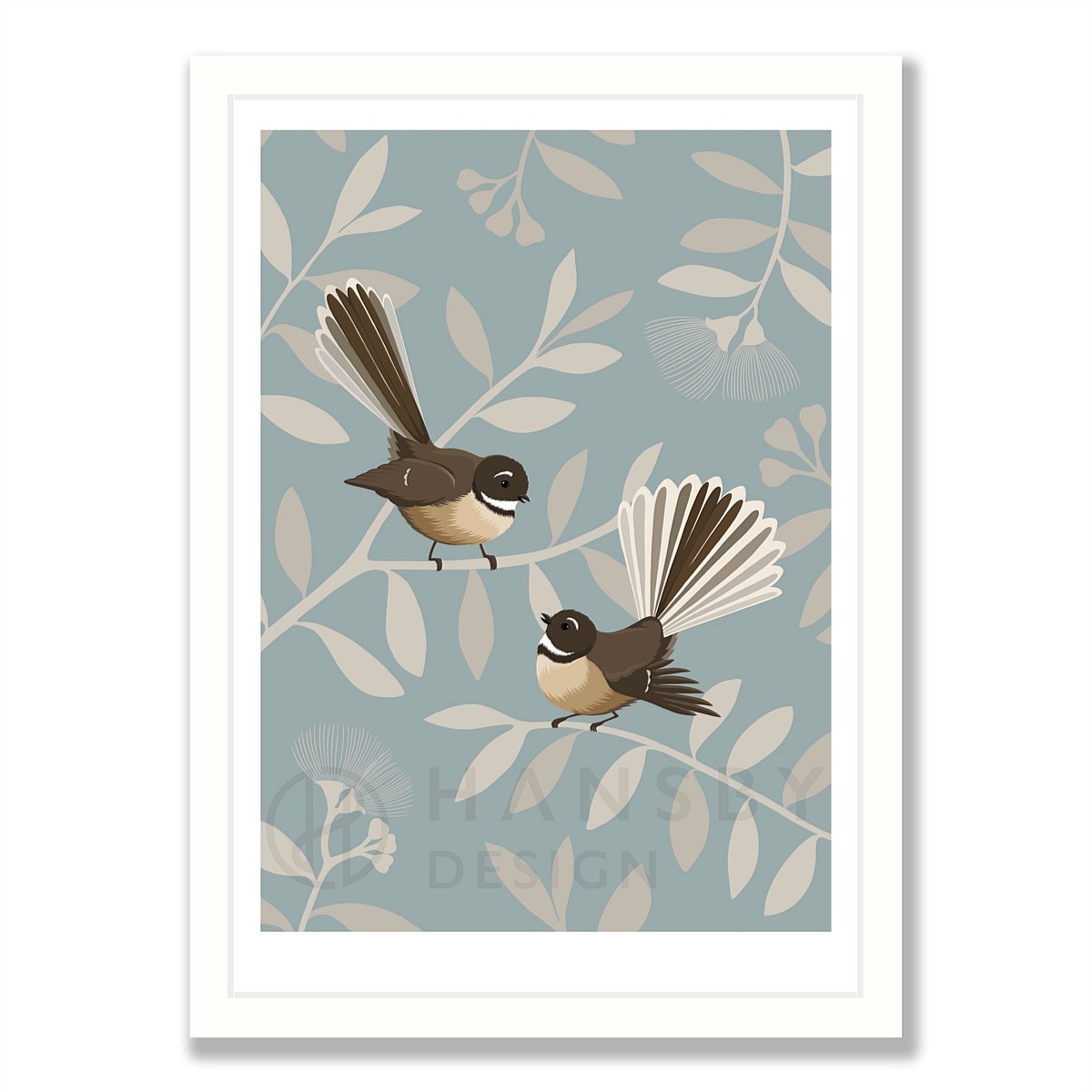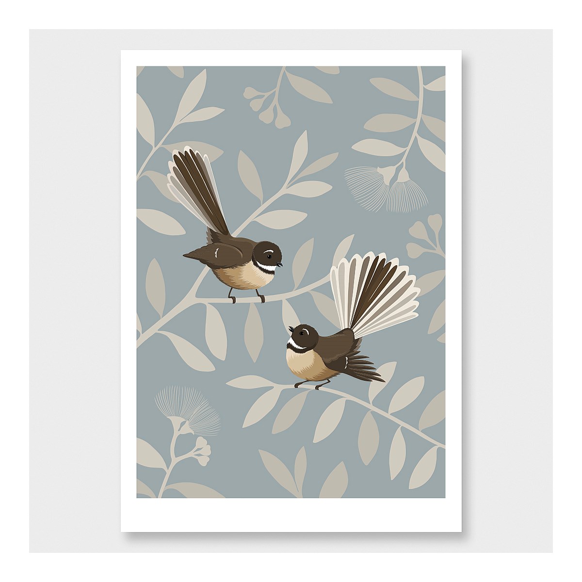 Created by local artist Cathy Hansby, drawn freehand using a digital tablet and desktop. Her modern style captures the personality of our unique wildlife, with bold colour and subtle detail. Cathy's art supports NZ Forest & Bird with their conservation work. This image features a dusky blue background with dove grey leaves, and chocolate tones. Each art print is printed to order, producing a high quality Giclee fine art print on smooth archival art paper. Giclee is one of the best reproduction methods available, using acid free paper and the latest archival inks. Prints have a lifespan over 100 years.