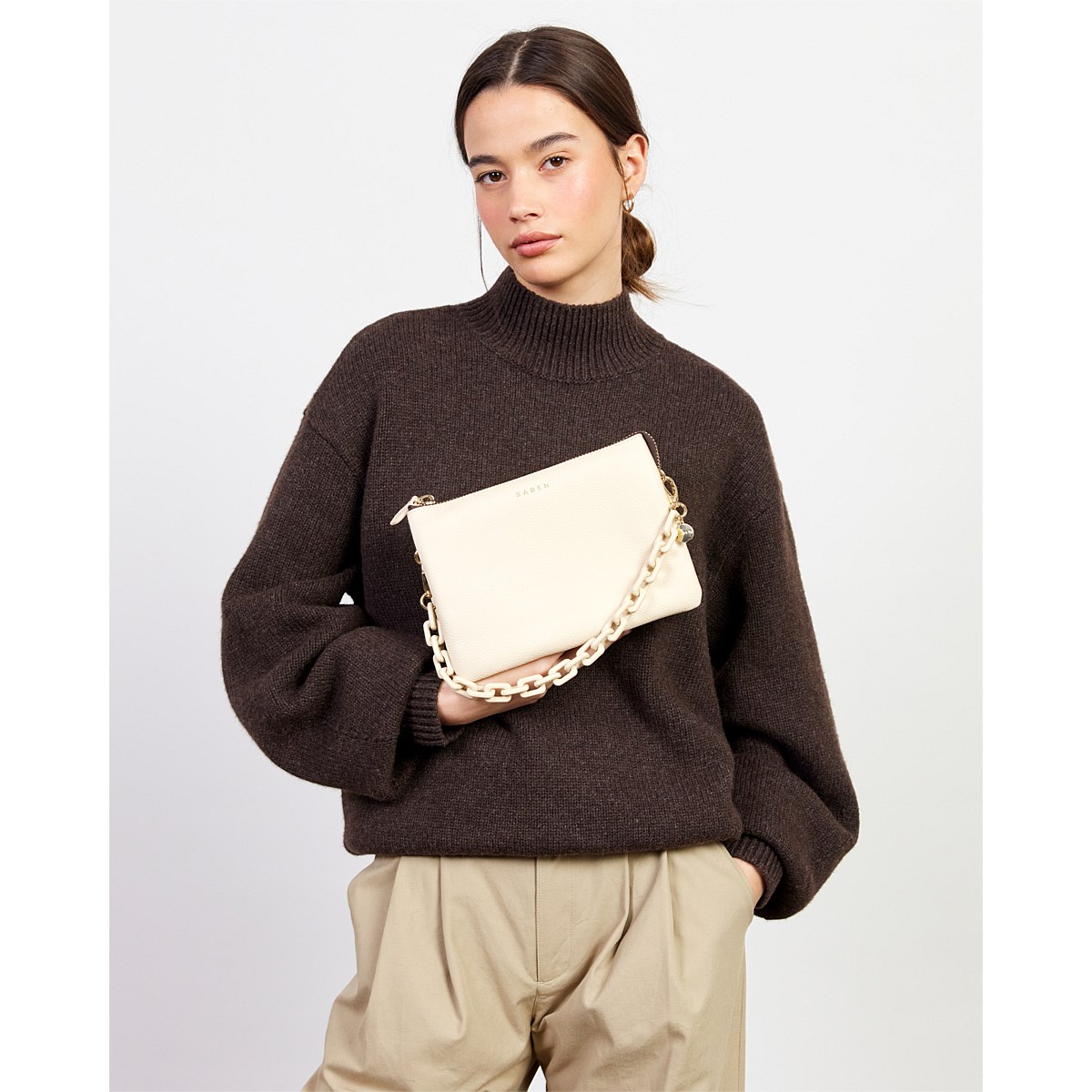 Transform any bag with one of our chain feature handles. Drape them across the front of your Saben piece as bag-candy or use them as small handles to create a glitzy clutch.