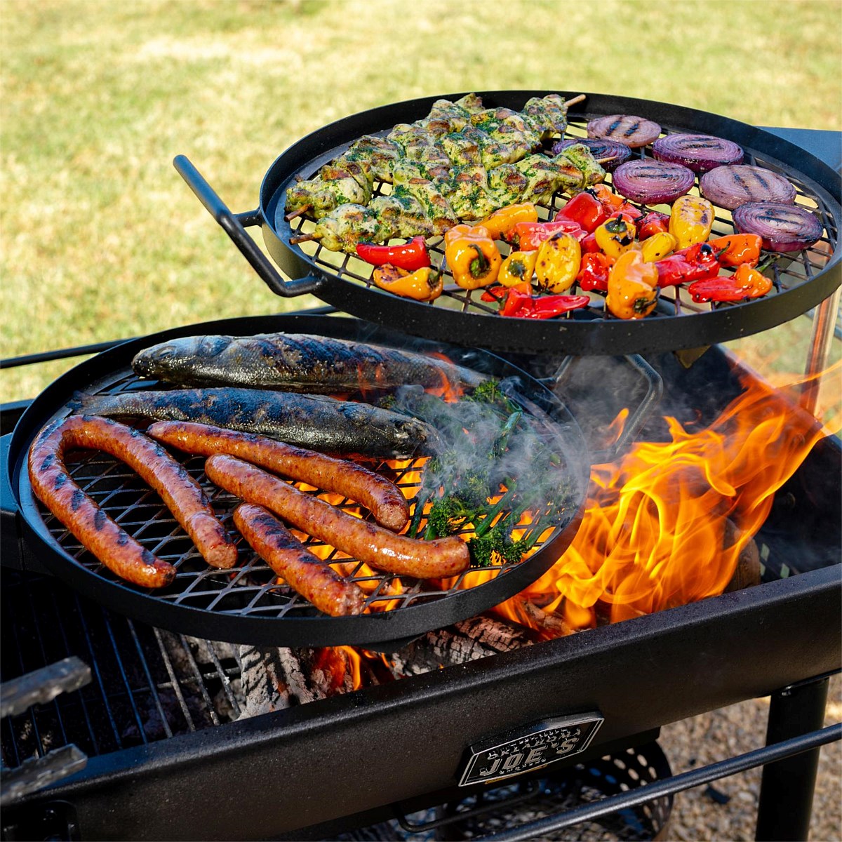 Grates: Two round, heavy-gauge wire cooking grates provide durability with two 48.26 cm stainless-steel elevation poles to set grates at different heights