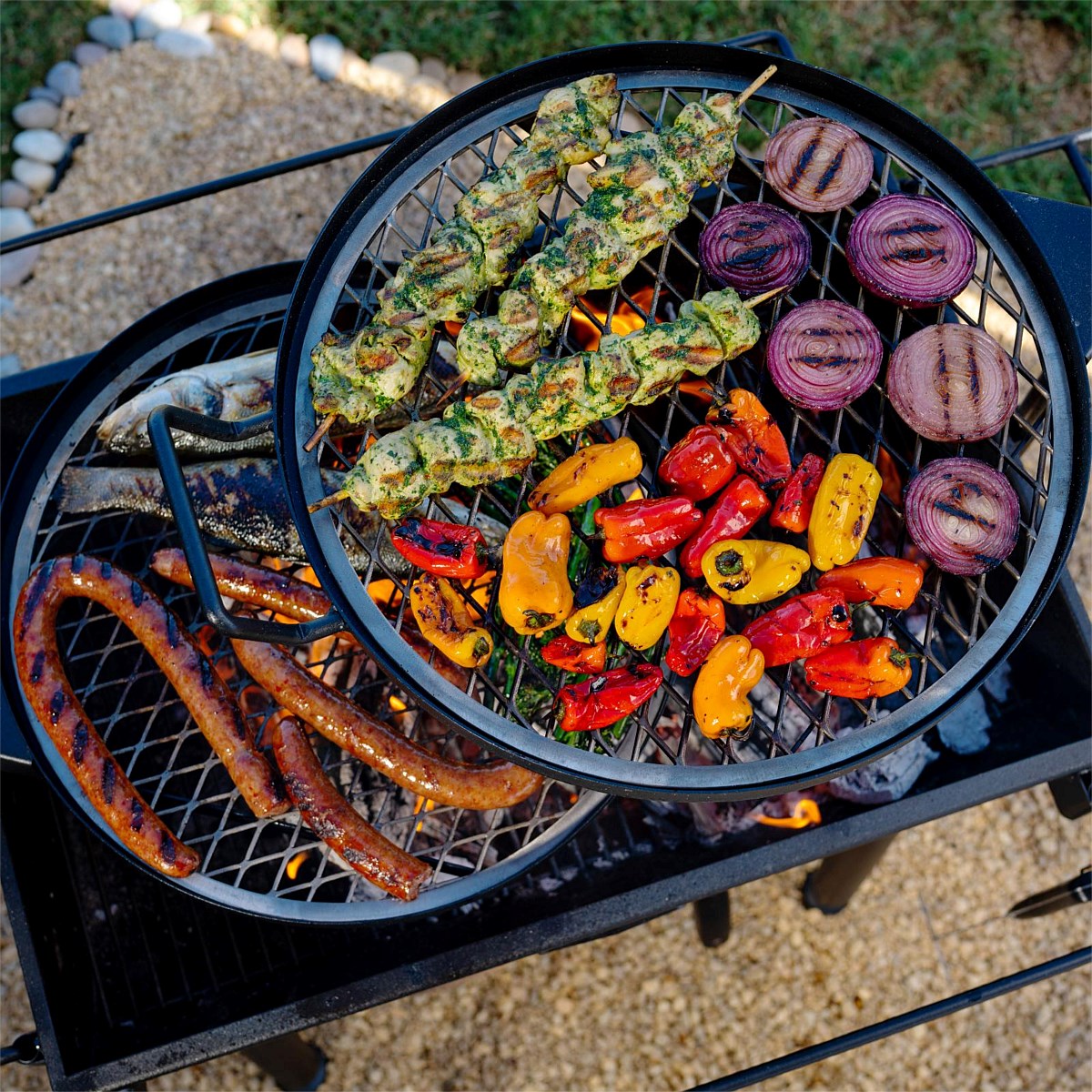 Open firebox design for 360° access to stoke the fire without disturbing your food