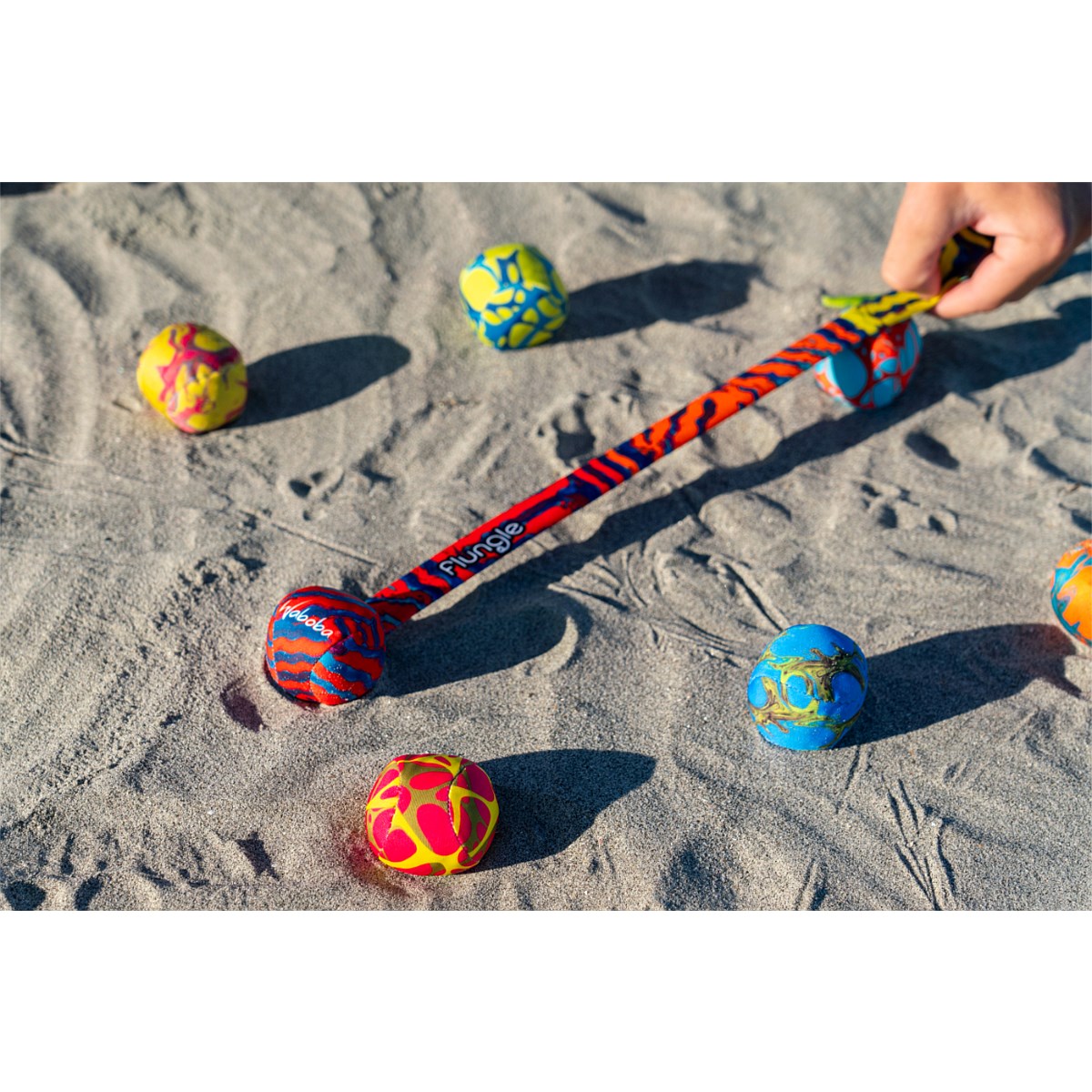 Bocce with a tail! Set comes with a flying Tailball target, and six colorful bocce sand balls for a 2-6 player game. Launch the target by the tail, and use it to measure points too.
