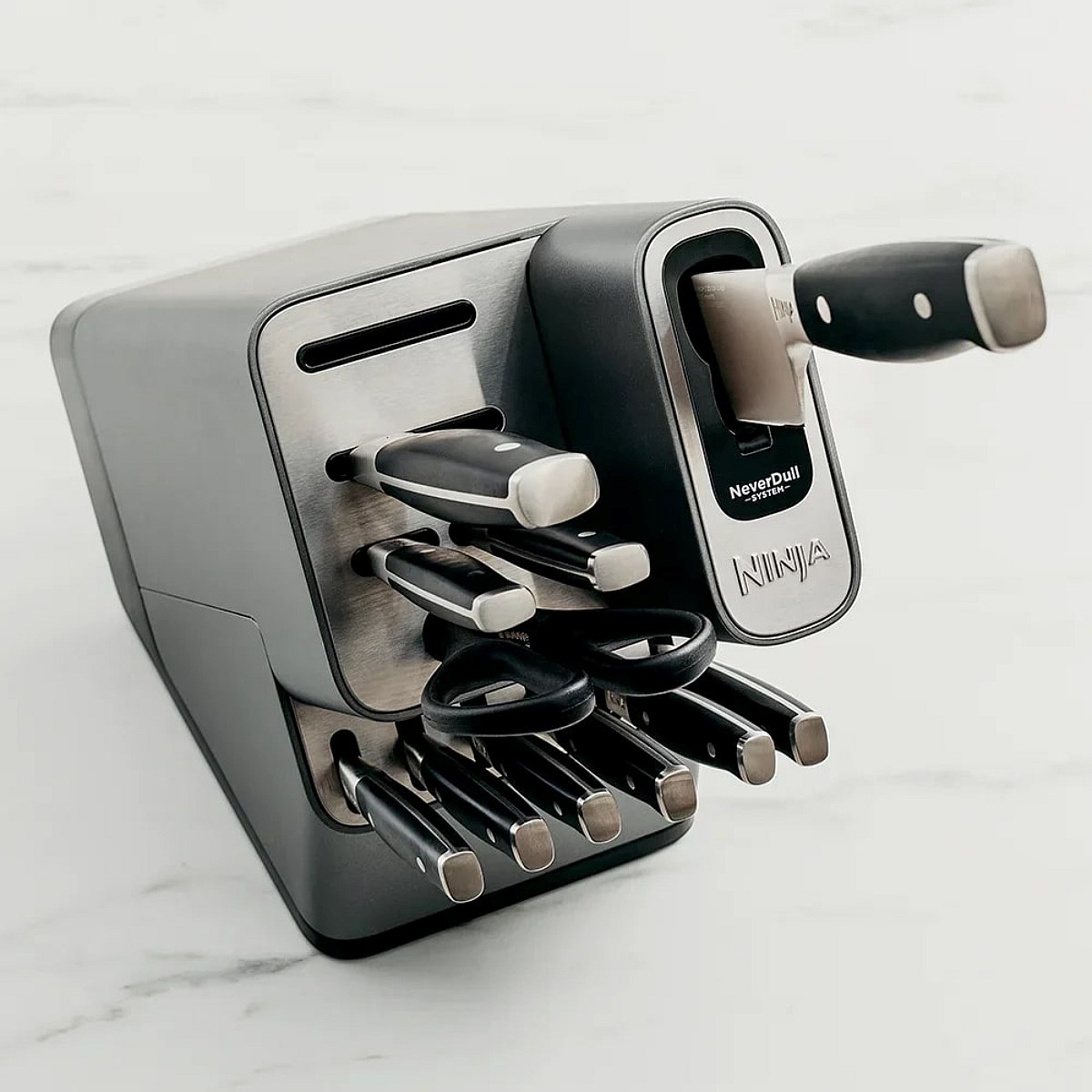 Introducing the Ninja Foodi NeverDull Premium Knife System, the premium knives that stay razor-sharp for over 10 years. This versatile 8 piece set features forged German stainless-steel blades that are durable and perfectly balanced for comfort and control.