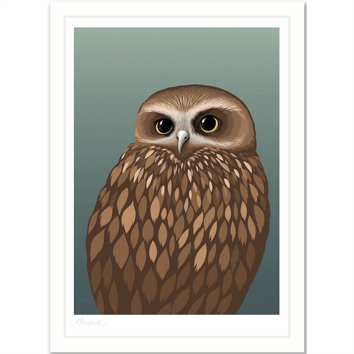 This image is set against a dusky blue sky background, with the Morepork in shades of cocoa brown and caramel. (Also available with a caramel background).