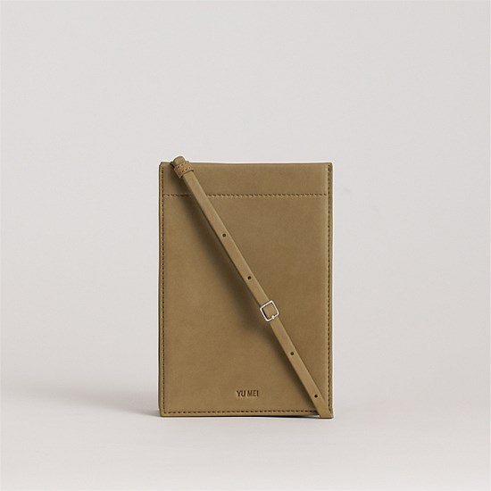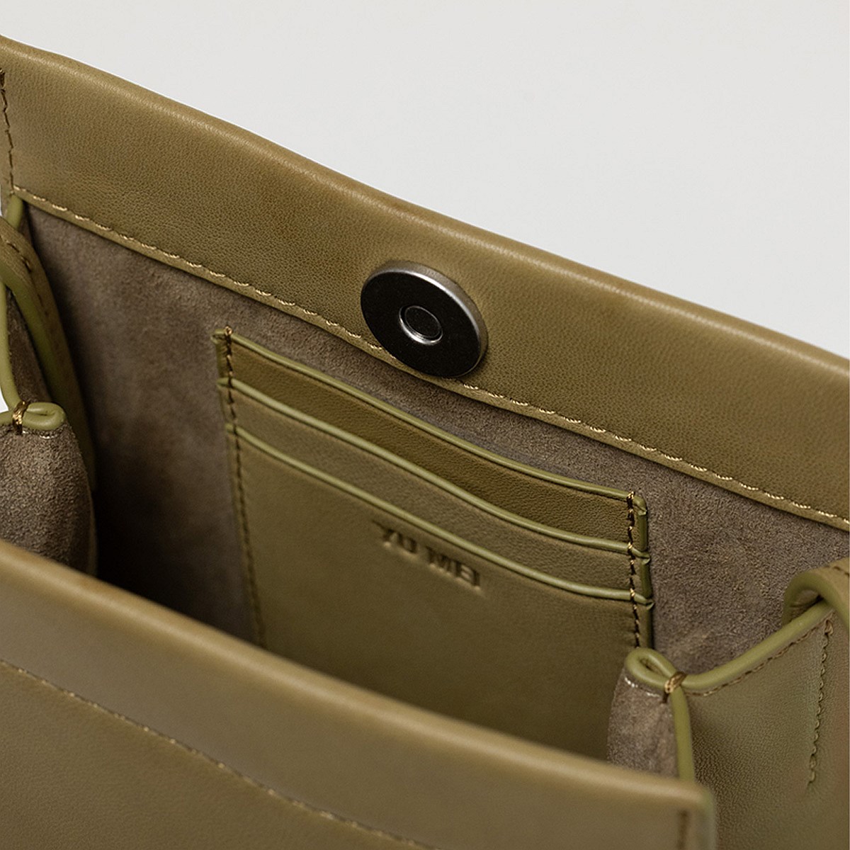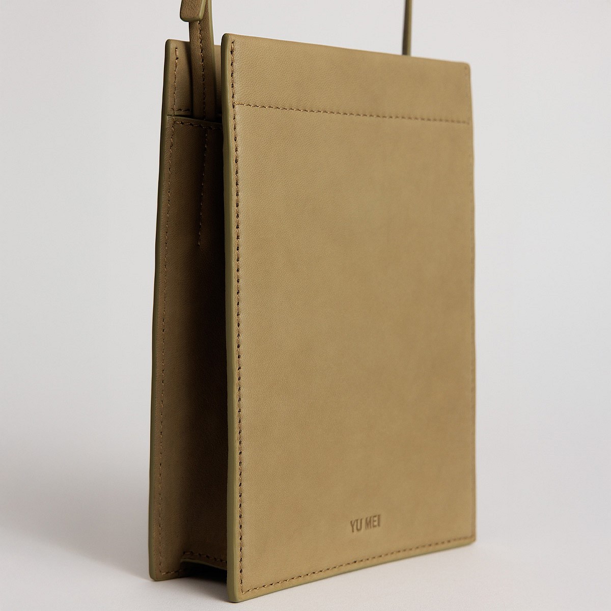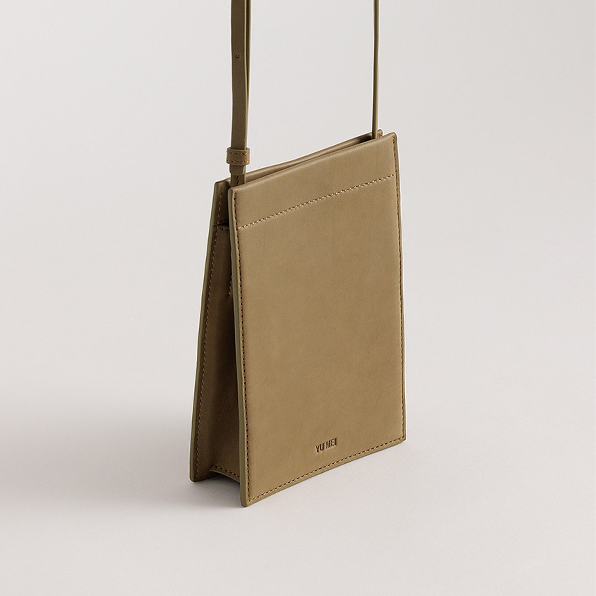 A compact cross-body bag in premium Lambskin with recycled suede lining. Designed to carry light essentials and keep its wearer hands-free, it features a snap close, card slots, and phone compartment.