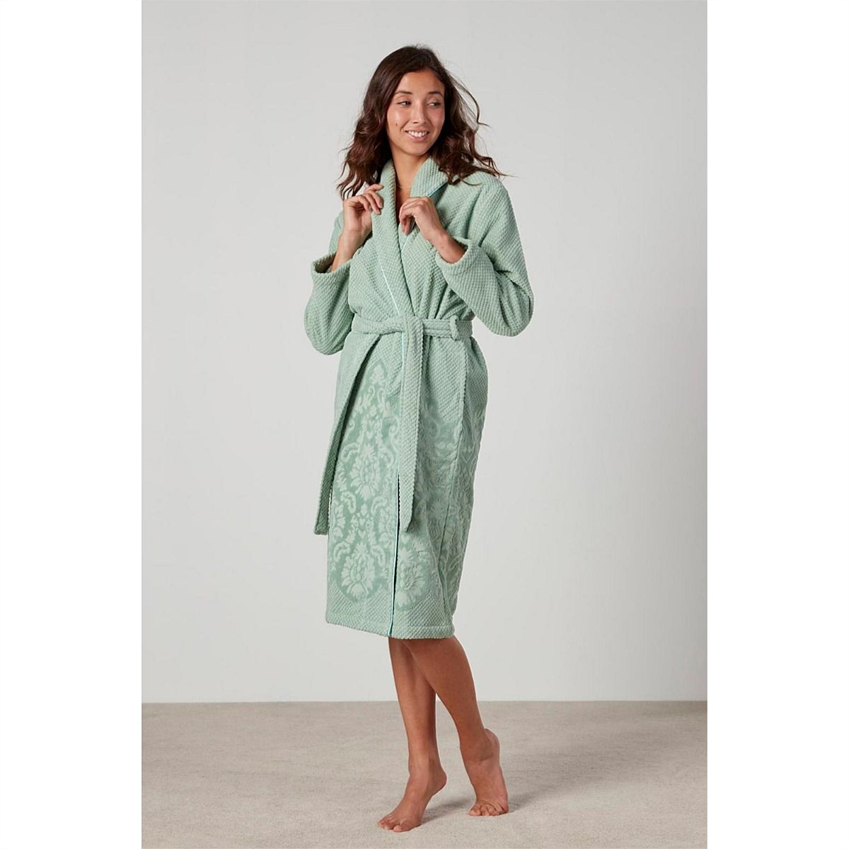 Based on the popular Hera Robe; small textured floral design. Now available in White, Clay and Ming Green