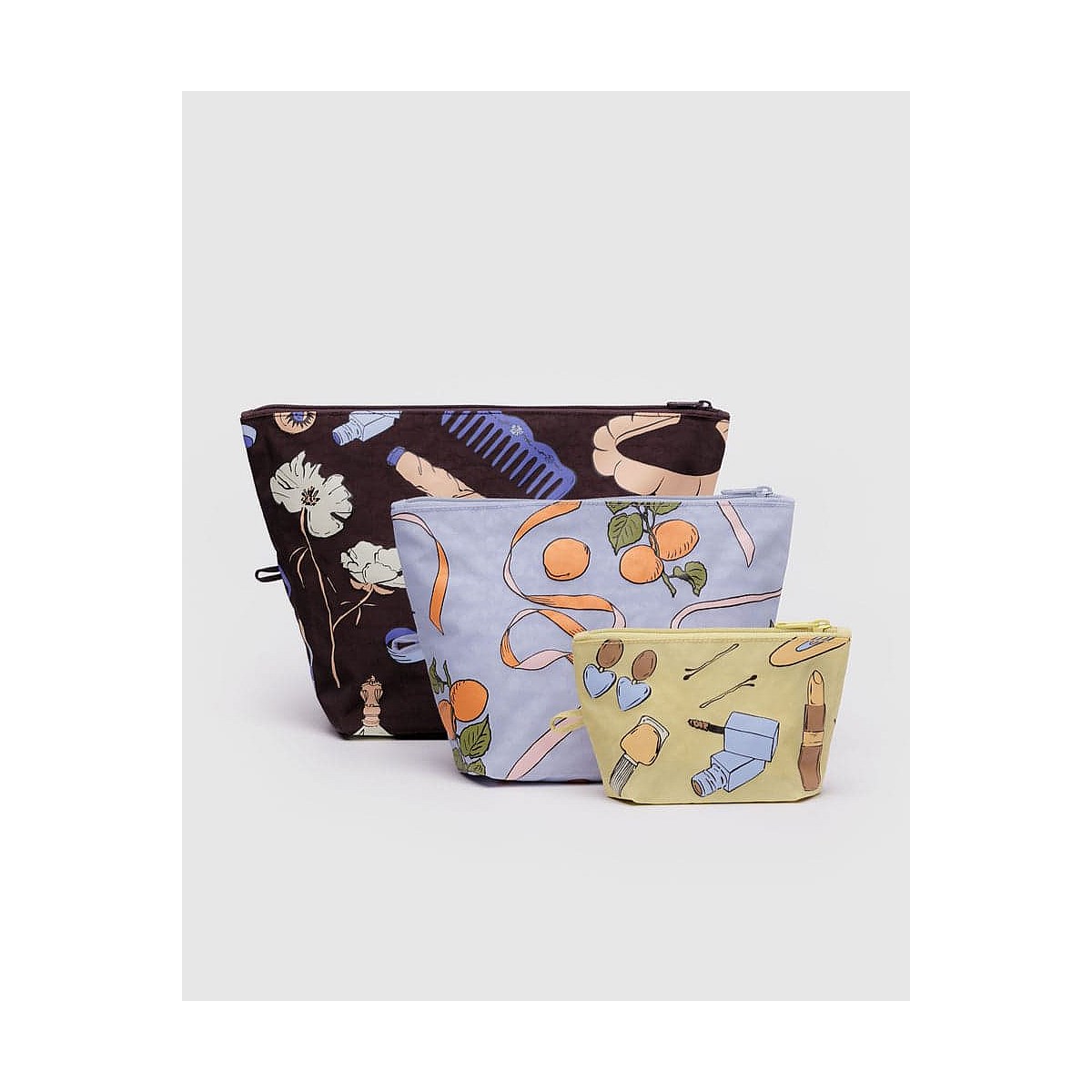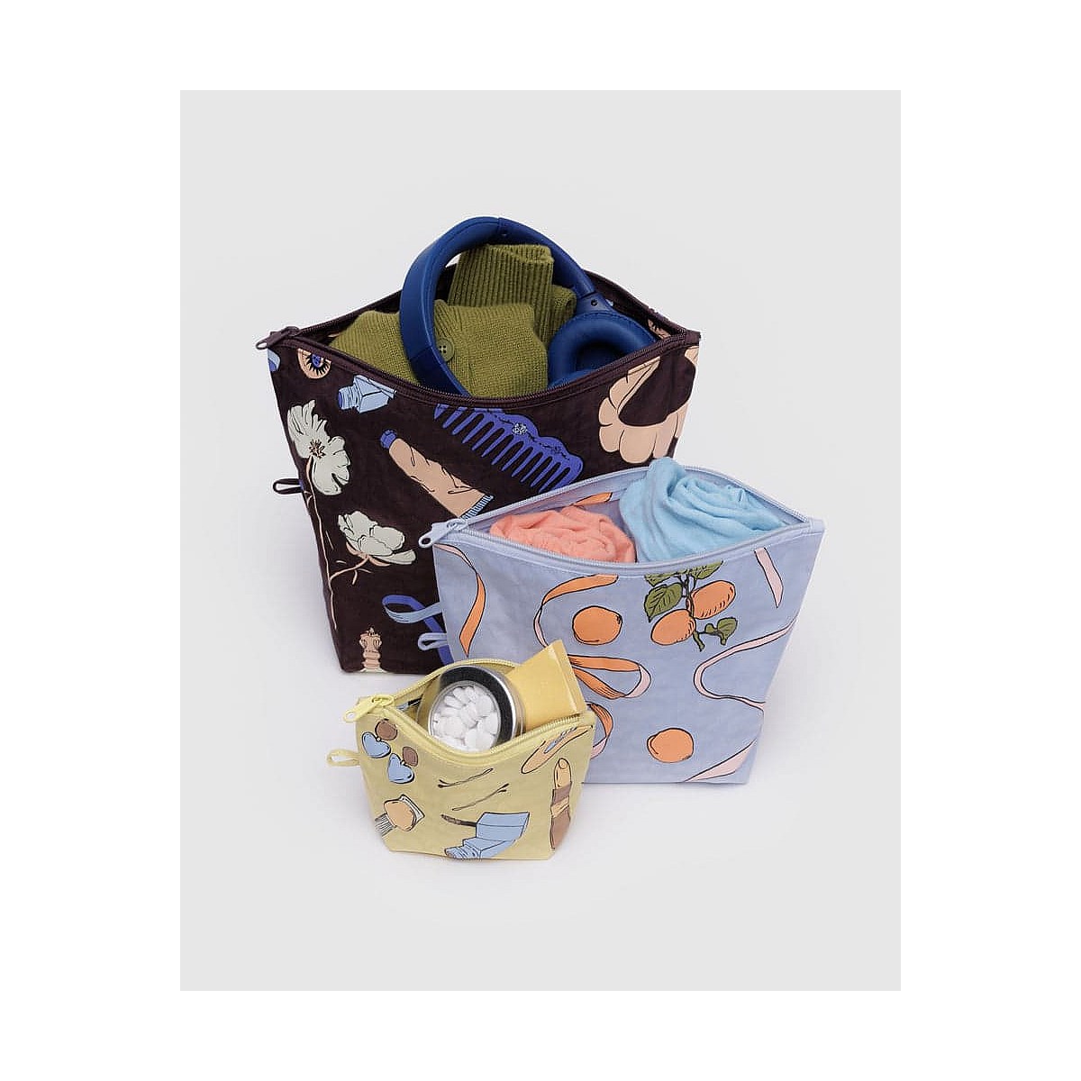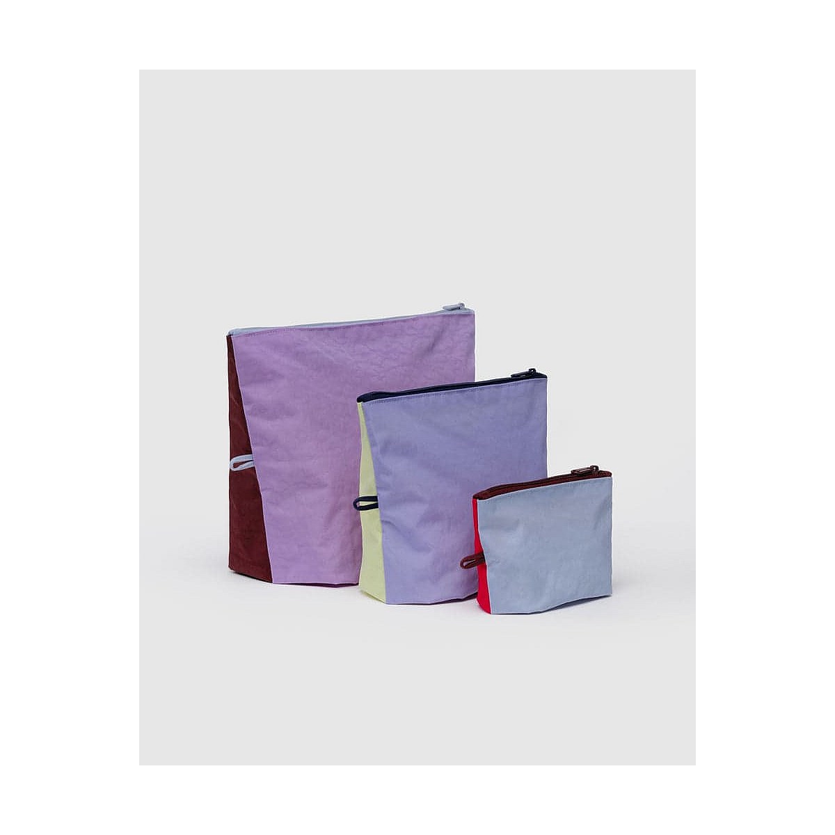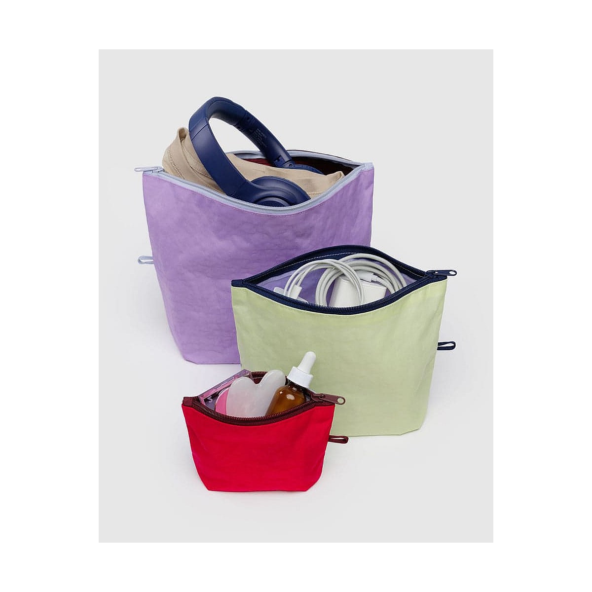 Our Go Pouch Set makes it easy to keep your bag neatly packed and organized. Whatever you're toting—coins, cords, or an extra pair of shoes—this set of three all purpose pouches keeps it together. They expand to hold your essentials and lay flat when not in use.