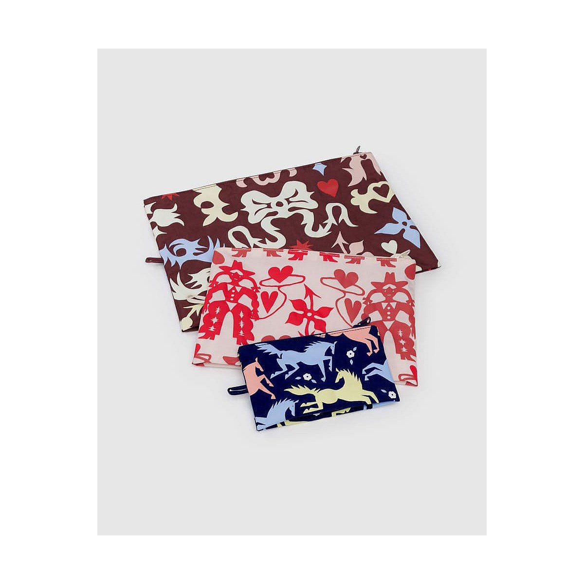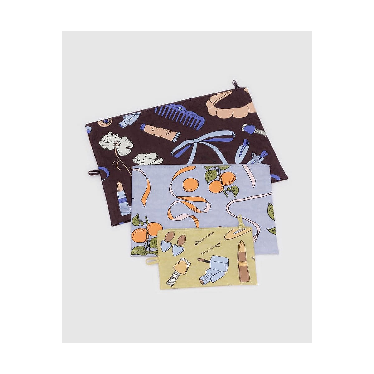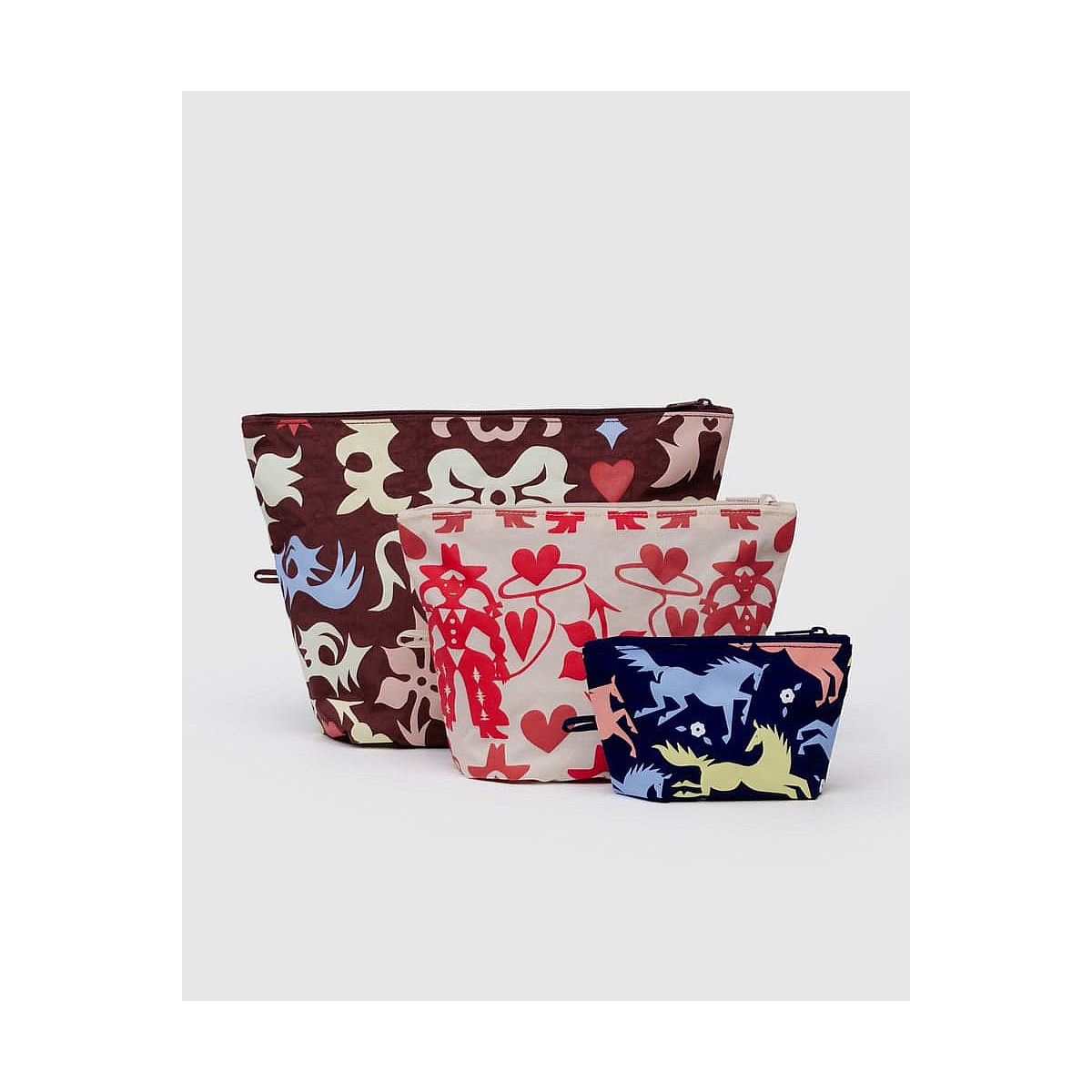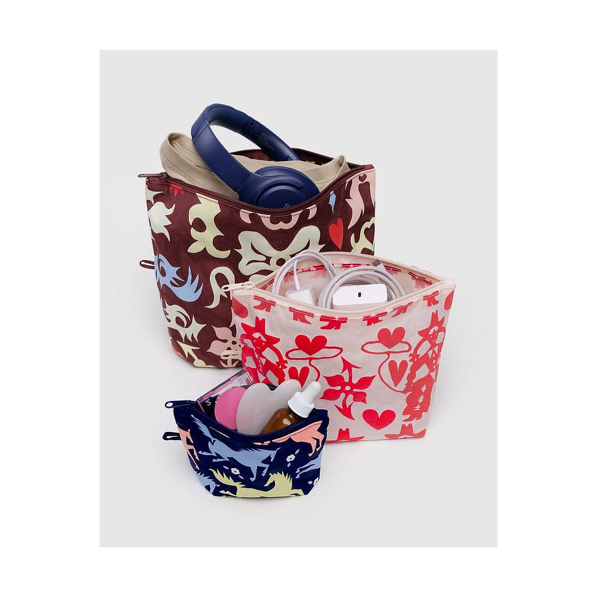 Our Go Pouch Set makes it easy to keep your bag neatly packed and organized. Whatever you're toting—coins, cords, or an extra pair of shoes—this set of three all purpose pouches keeps it together. They expand to hold your essentials and lay flat when not in use.