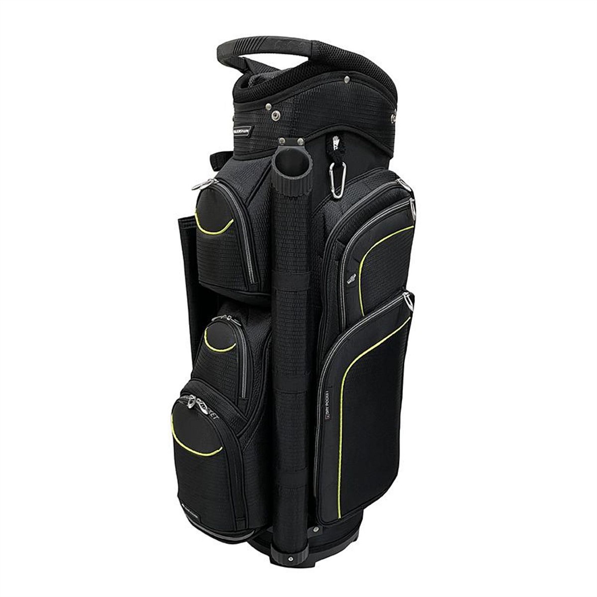 The Champion bag is a lightweight cart bag boasting premium features like 14-way top with full length dividers, external putter pit, umbrella sheath and full-size rain coverall. With 9 high-volume pockets, there is vast space for all your equipment and accessories like the cooler pocket with drainage eyelets, dry pocket and the waterproof valuables pocket. It also features an electric buggy compatible base for optimal stability and dual easy-lift grab handles for easy manoeuvrability.