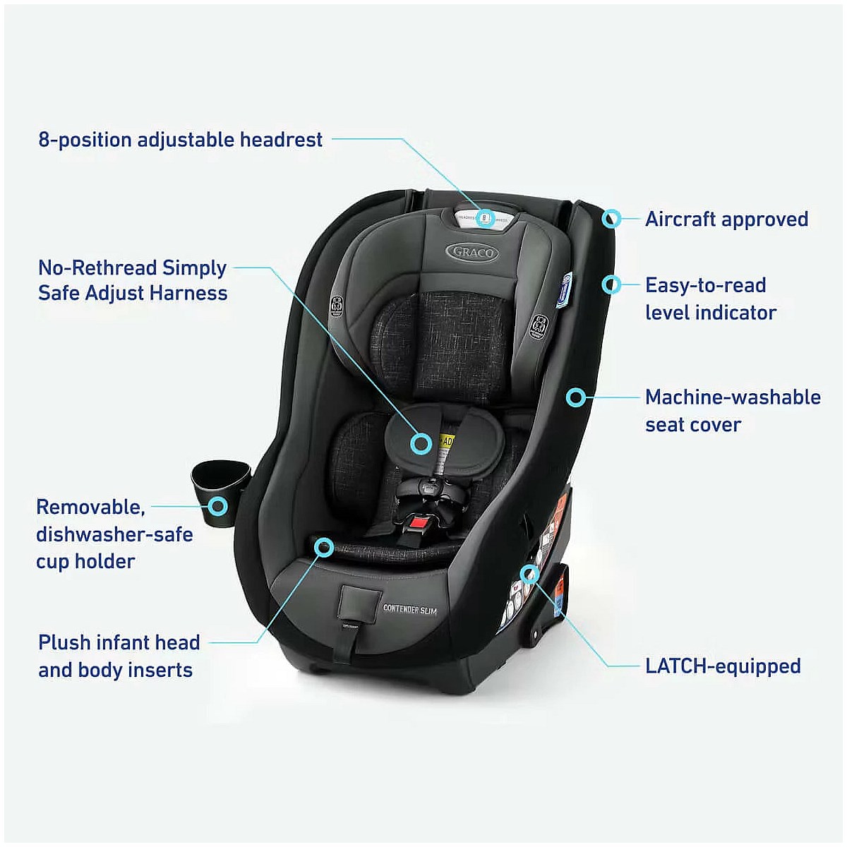 The Graco Contender Slim Convertible Car Seat features 2 modes of use to grow with your child.