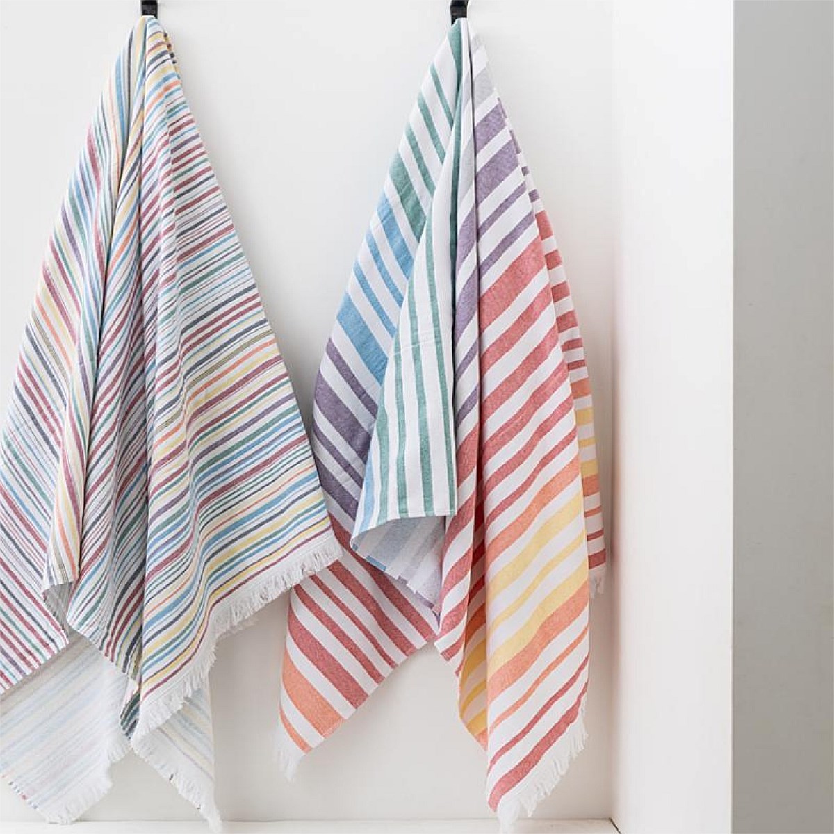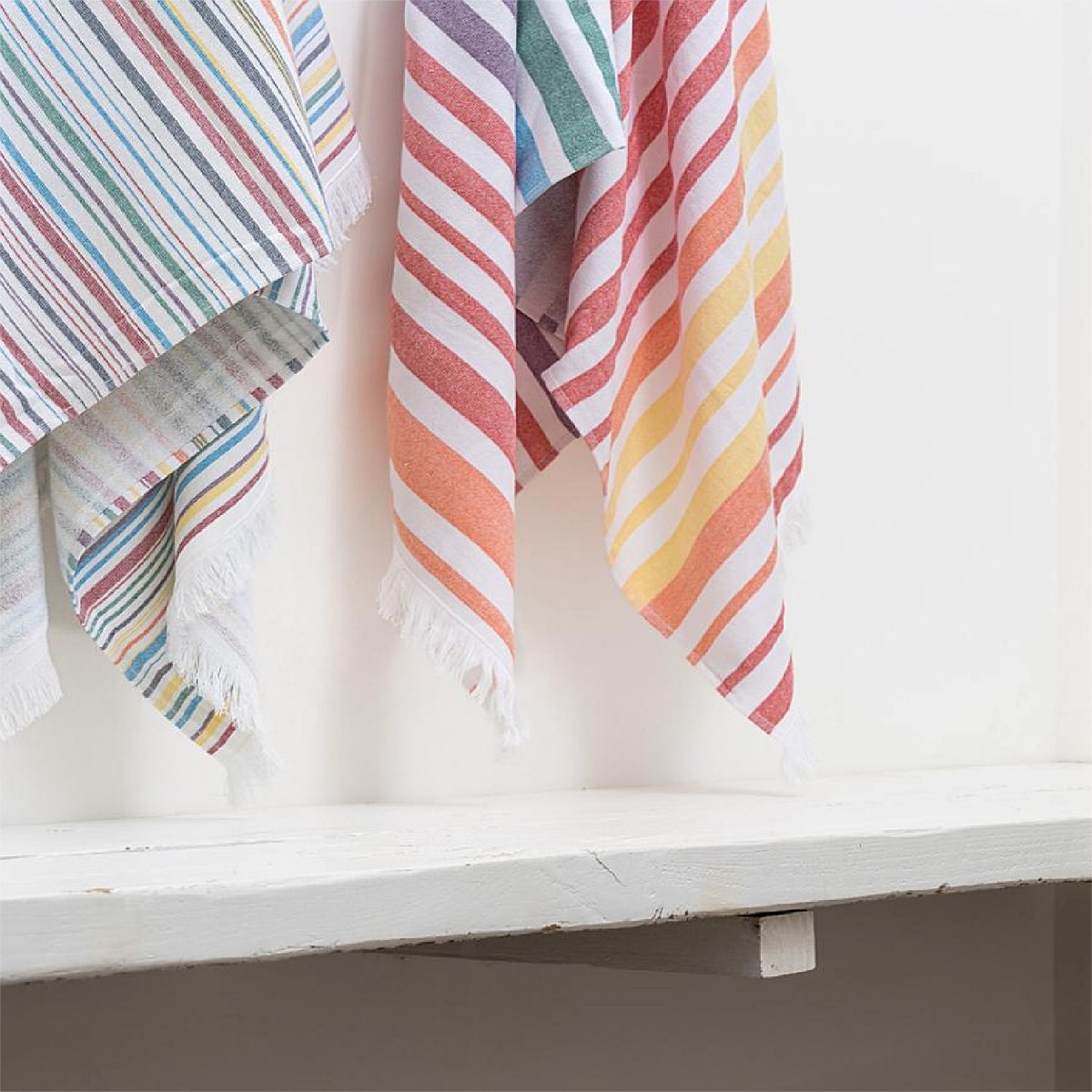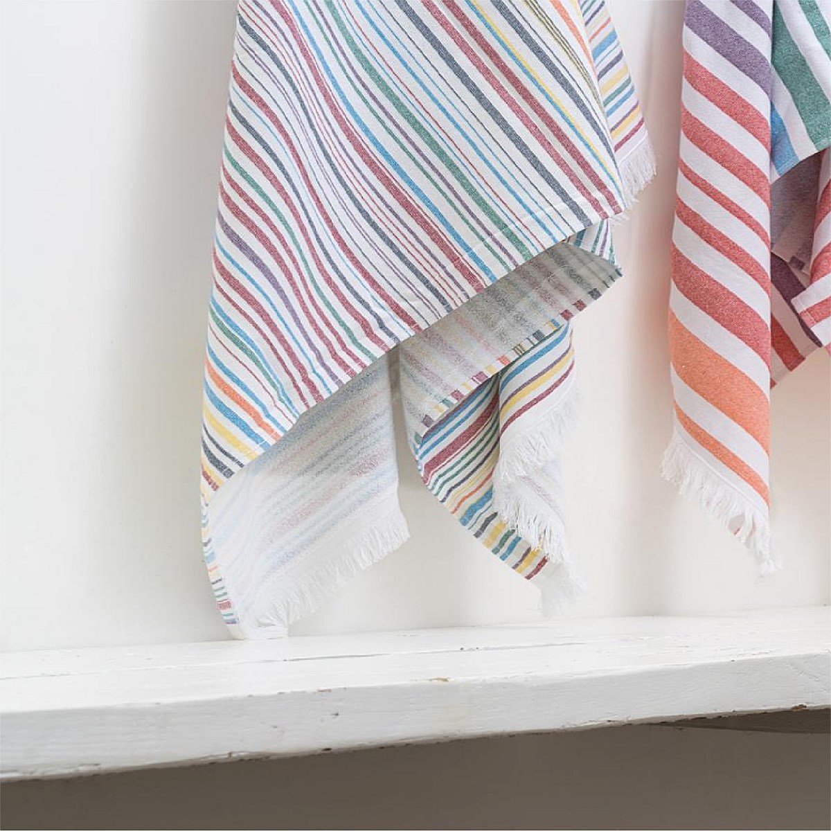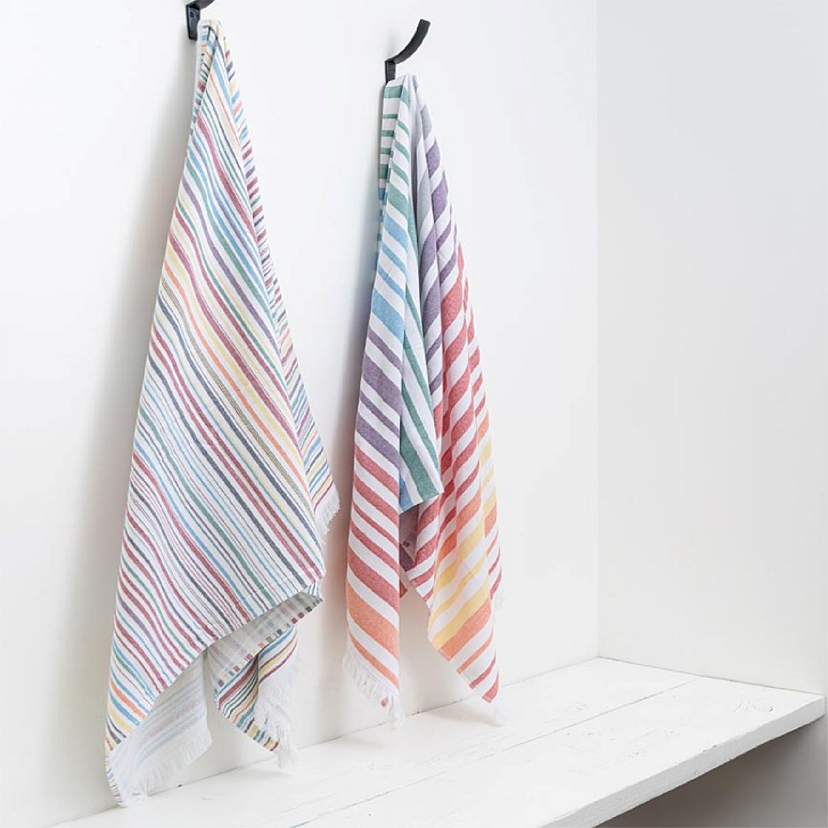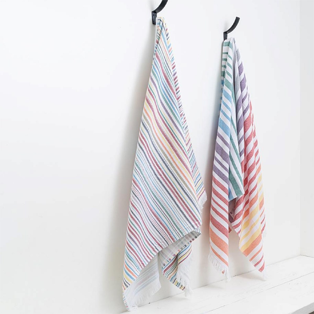 This peshtemal features a multi-coloured striped design in either wide or thin stripe options. With a terry towelling backing and tasselled ends, the Hahei peshtemal is absorbent, cosy, and ideal for use by the pool or at the beach.