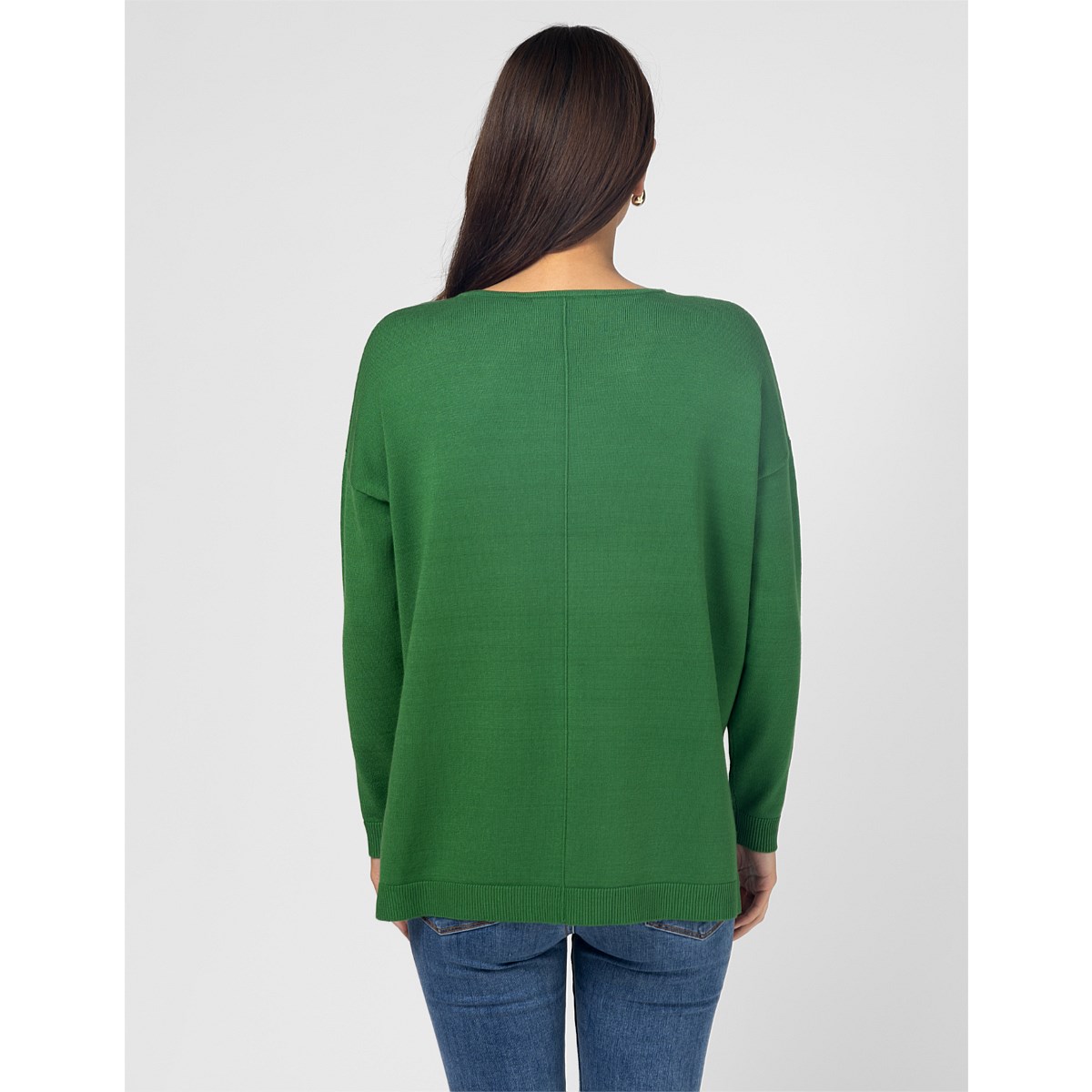 Relaxed fit knit with rolled neckline edge, rib trim on cuffs and hemline and jersey knit body. Exposed seam detail on centre front and back.