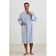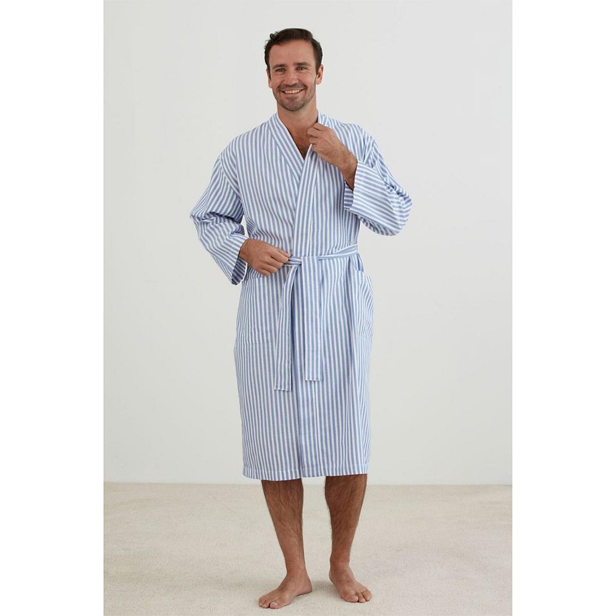 Blue and white stripe lightweight, kimono-style robe ensures breathability and practicality. Featuring two pockets and a waist tie.