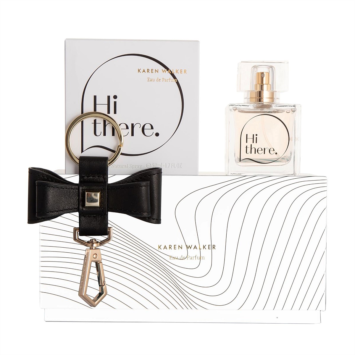 Karen Walker Hi There is sparkling, bright and dynamic. This fresh eau de parfum focuses on the energy and optimism that spills over into every aspect of the designer’s busy lify. Green Melon, Pink Peppercorn, Rose and Lily of the Valley combine with Cedarwood and subtle Amber. This gift set comes with a Hi There 50ml and a black leather double bow keyring.