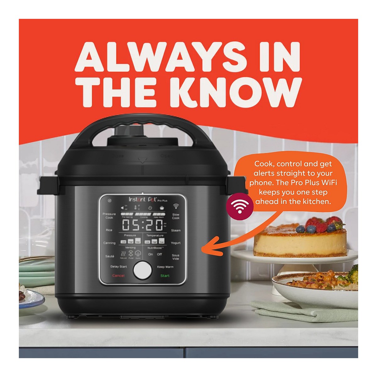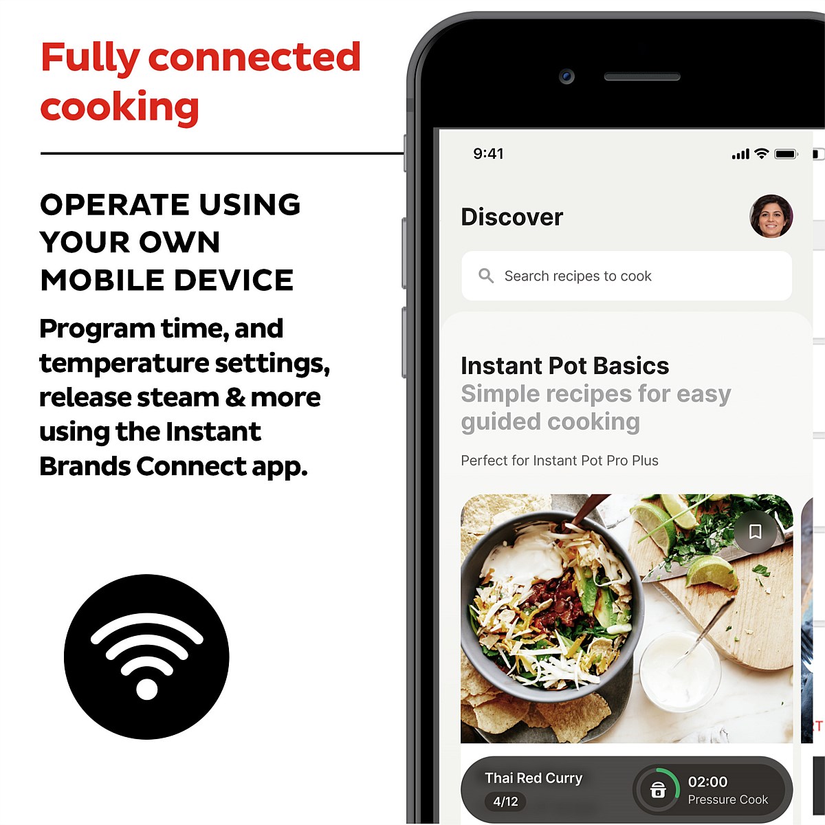 The Instant Pot Pro Plus is a fully connected multi-cooker that lets you wirelessly operate the unit through the Instant Brands Connect app. Simply select from one of 800+ smart recipes and the app will wirelessly program the Instant Pot Pro Plus. Simply follow the cooking instructions in the app. It will tell you when it’s time to add ingredients, adjust settings, and when your meal is ready to serve.