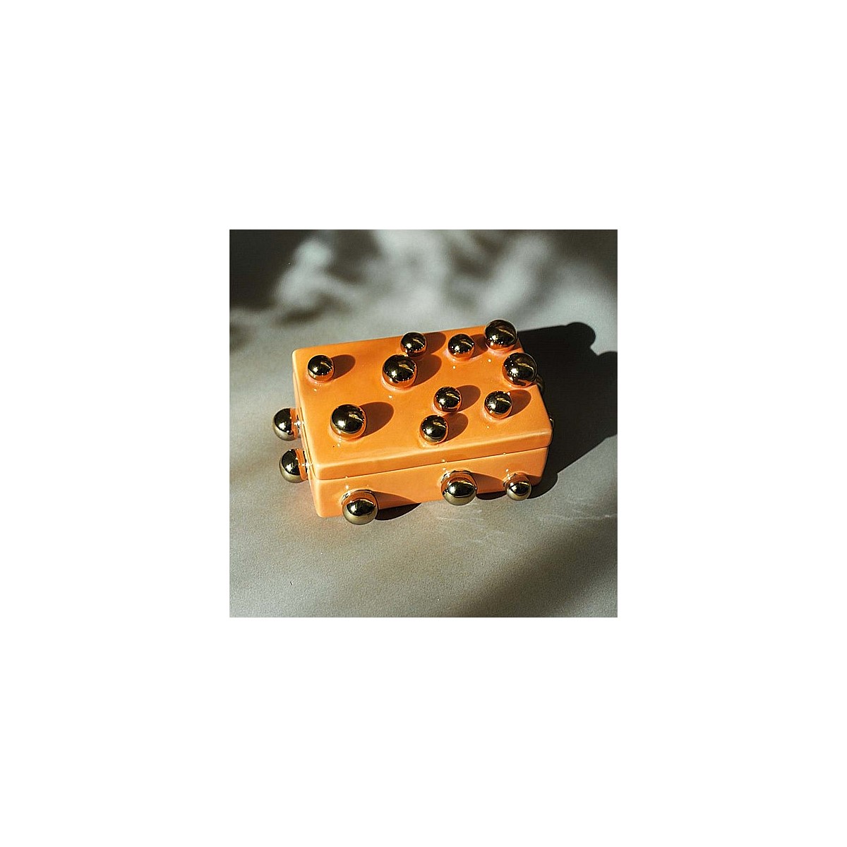 The Jasmin Sparrow jewellery box takes inspiration from a vintage piece discovered during travels to Barcelona. Crafted from ceramic with a Tangerine orange gloss finish, it features irregular gold baubles that have an organic feel.