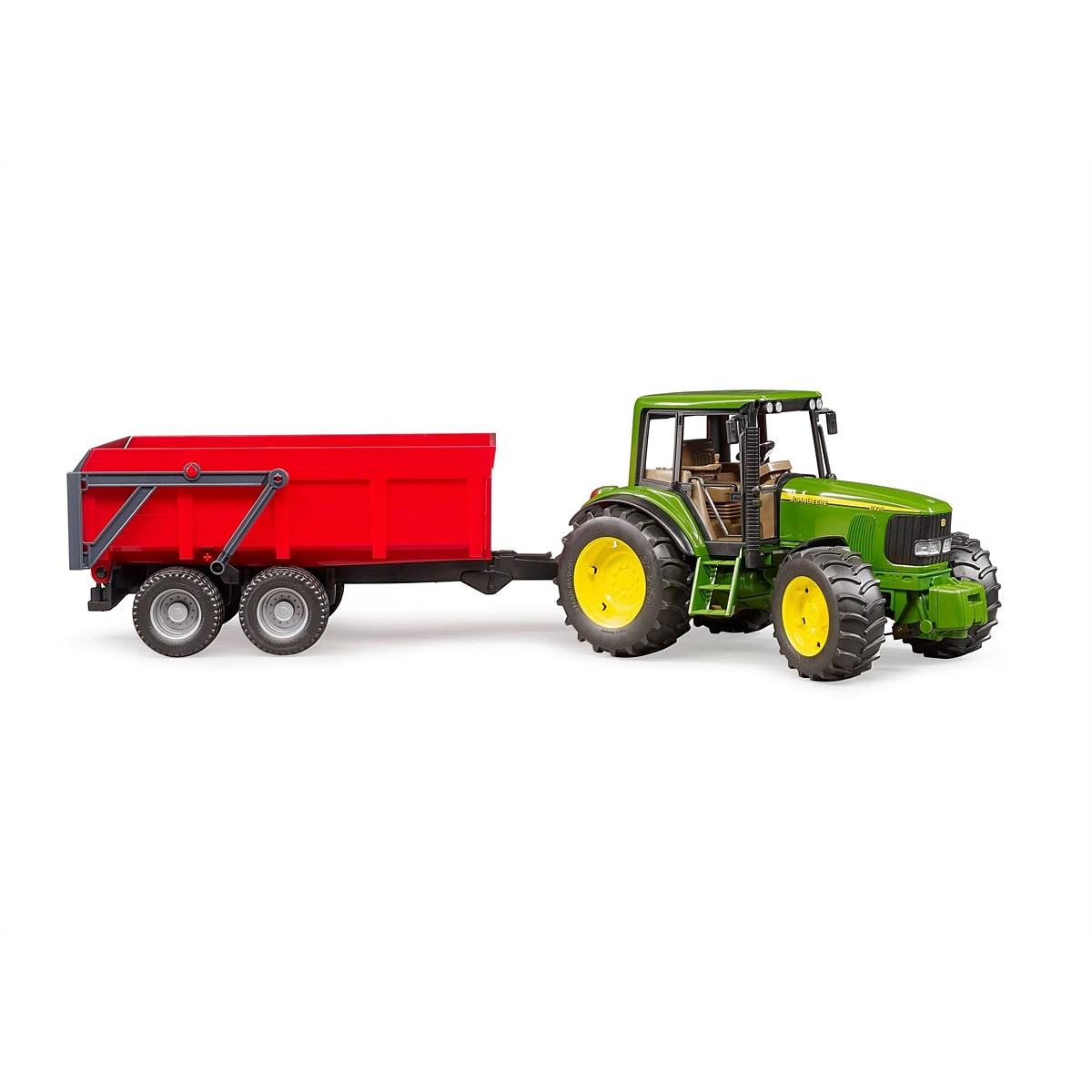 The John Deere 6920 is a powerful and reliable agricultural tool. This model has been a firm member of the BRUDER range for a long time. The engine bonnet can be opened to reveal the engine block. The off-road front axle can be steered either directly via the movable steering wheel in the cab or via the steering rod extension included, which children can attach to the movable steering wheel through the sliding roof in the cab. The tilting trough of the trailer folds up as part of which the tailgate automatically opens. Reconnect the linkage to use the grains discharge tool. Tread tyres round off the product. All numerous trailers and trailer attachments of the Professional series can be combined with the John Deere 6920 tractor to better illustrate to young farmers how fields are tilled and thus agricultural produce is grown.