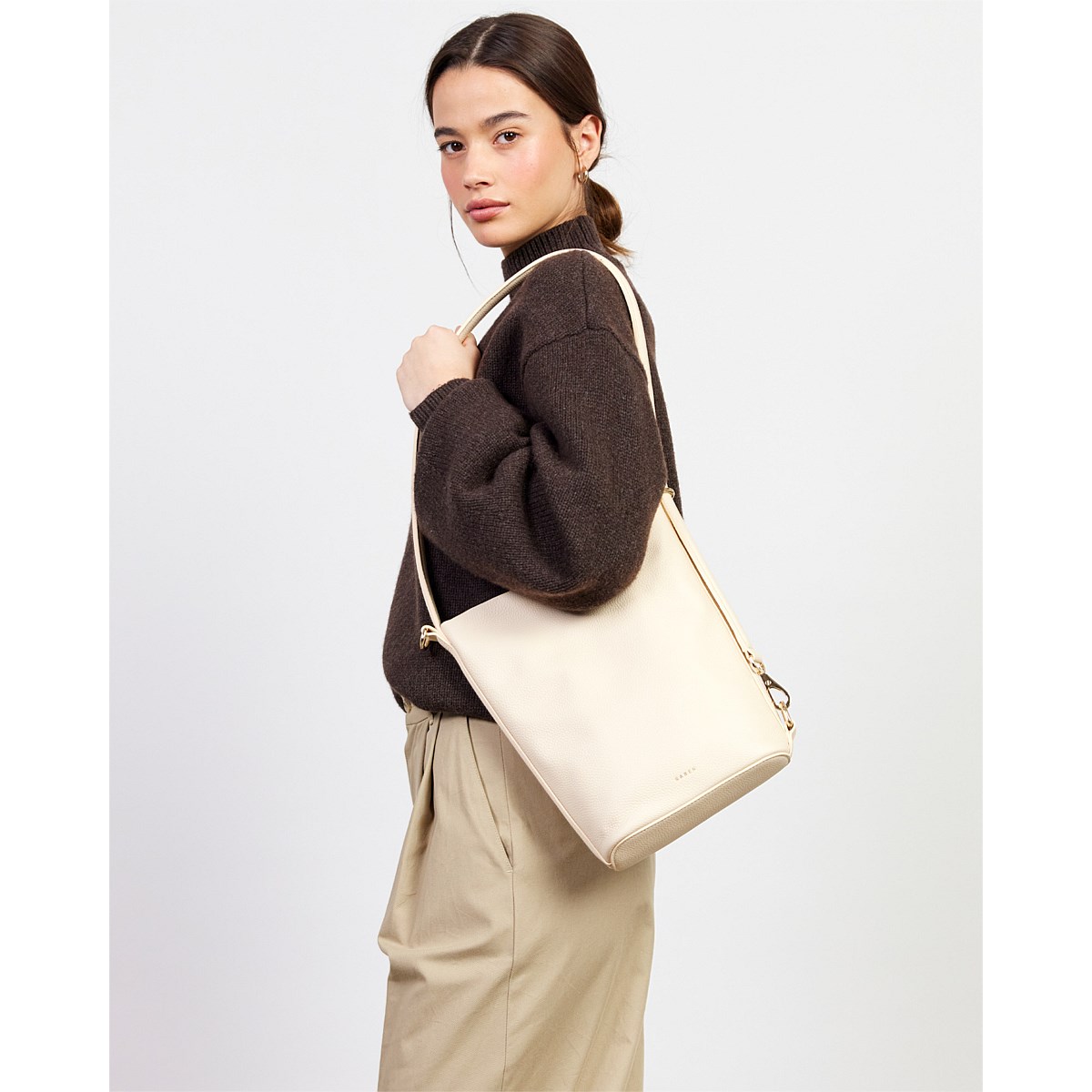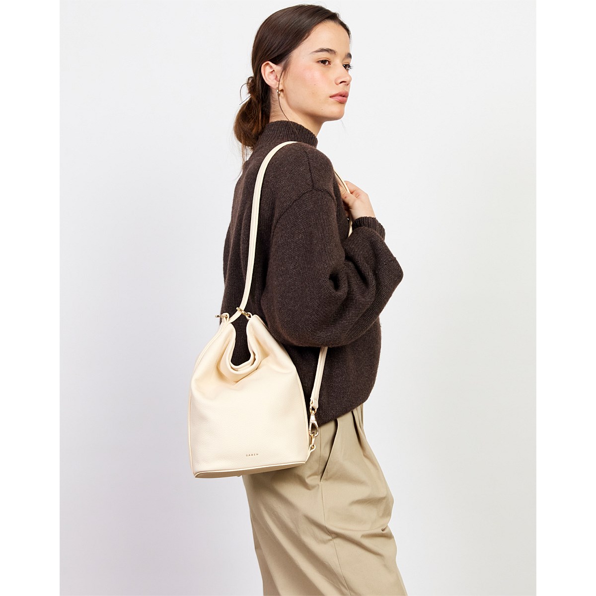 A sleek mid-sized bucket style bag; the smaller sister to our generous bucket tote June. Jojo delivers the same sophisticated functionality in a more compact form. Perfect for those who prefer to carry with intention rather than excess, while maintaining the effortless style transition from shoulder to crossbody wear. Simply unclip the signature SABEN hardware to transform it into a chic crossbody – versatility refined.