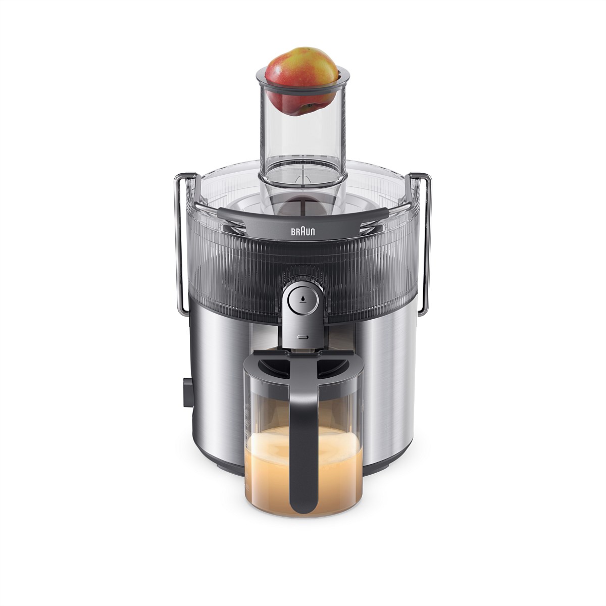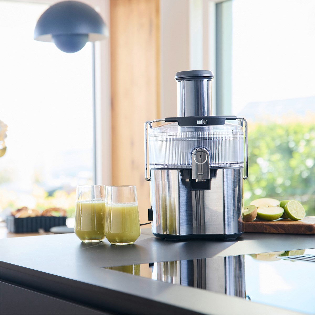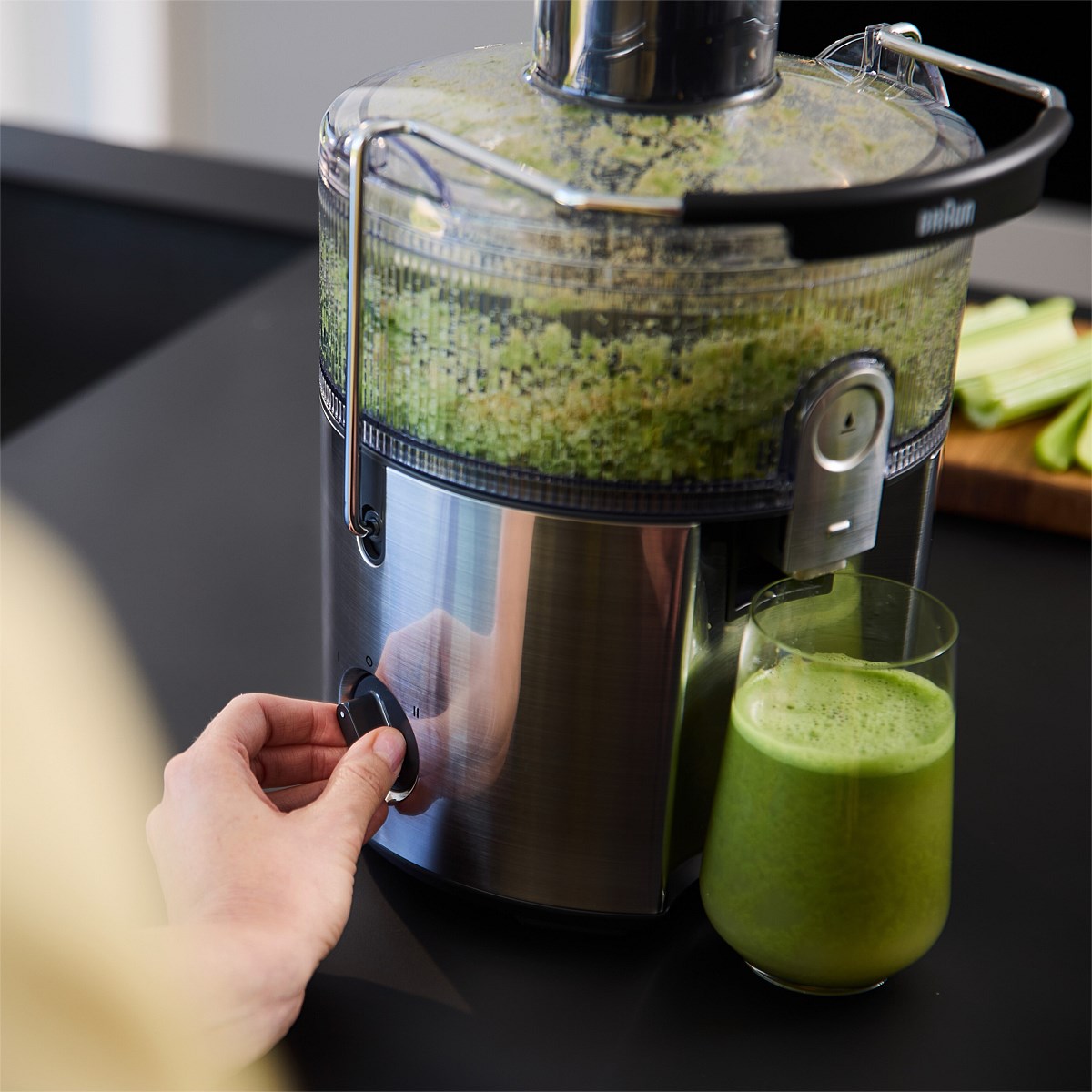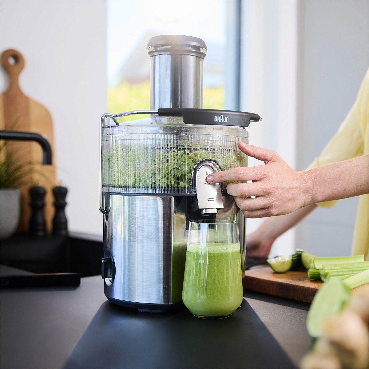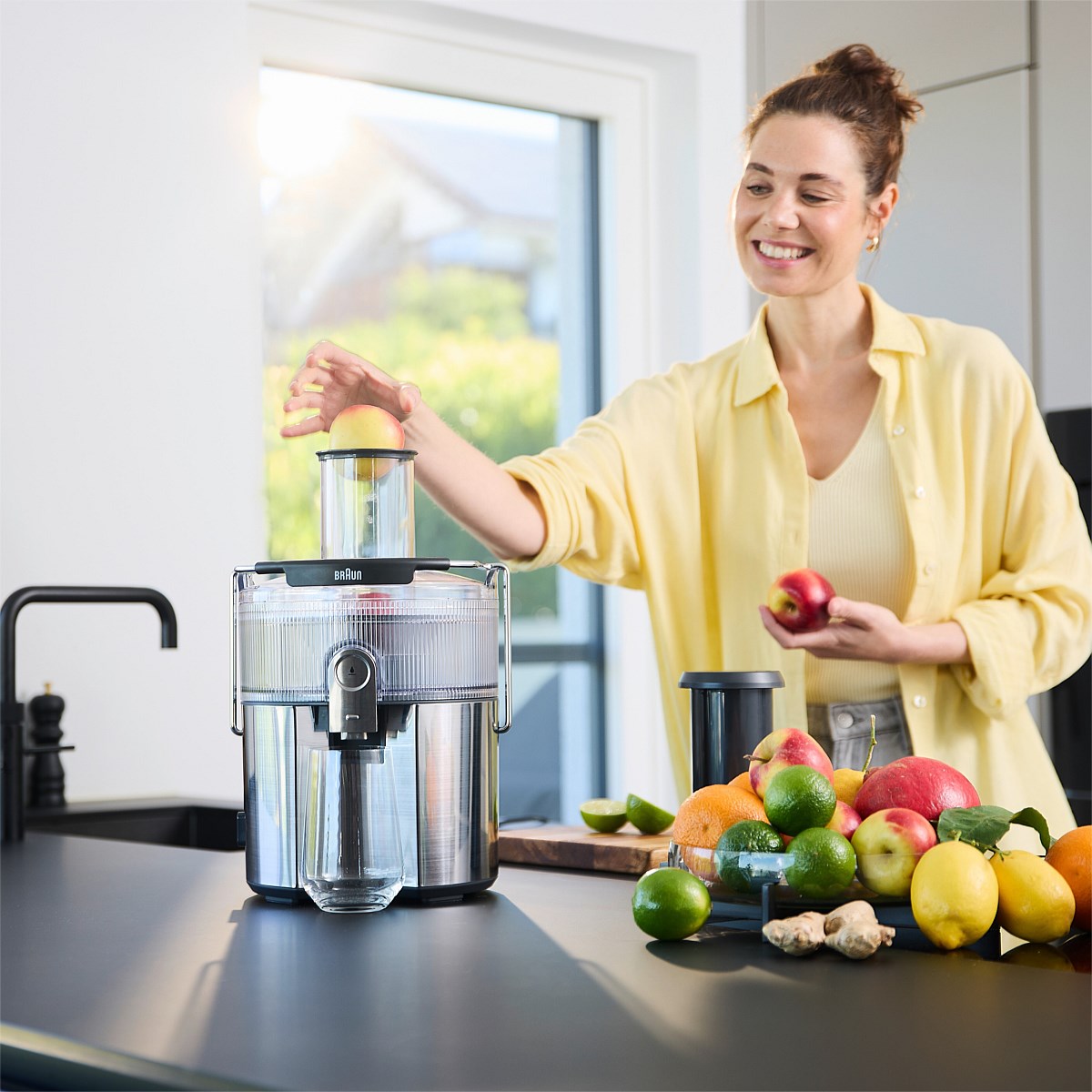 With the new MultiJuice7, you can effortlessly blend the goodness of fresh fruits and vegetables into every glass. Braun's FastXtract Technology delivers a full glass* of juice in less than 15 seconds. To ensure the preservation of vital nutrients during extraction, both series are equipped with Braun's exclusive ColdXtract Technology. This technology limits the temperature increase during juicing to less than 1.5 degrees C, ensuring the juice remains nutrient-packed. The 75 mm filling chute fits large pieces of fruits and vegetables, even whole apples, and thanks to the 2-speed settings, you can efficiently process any vegetables or fruits.