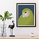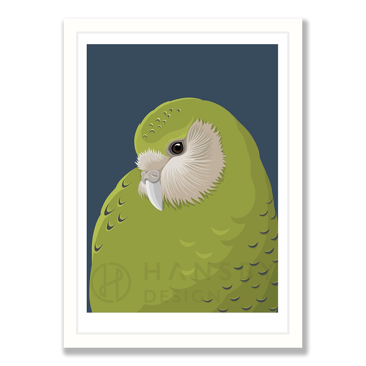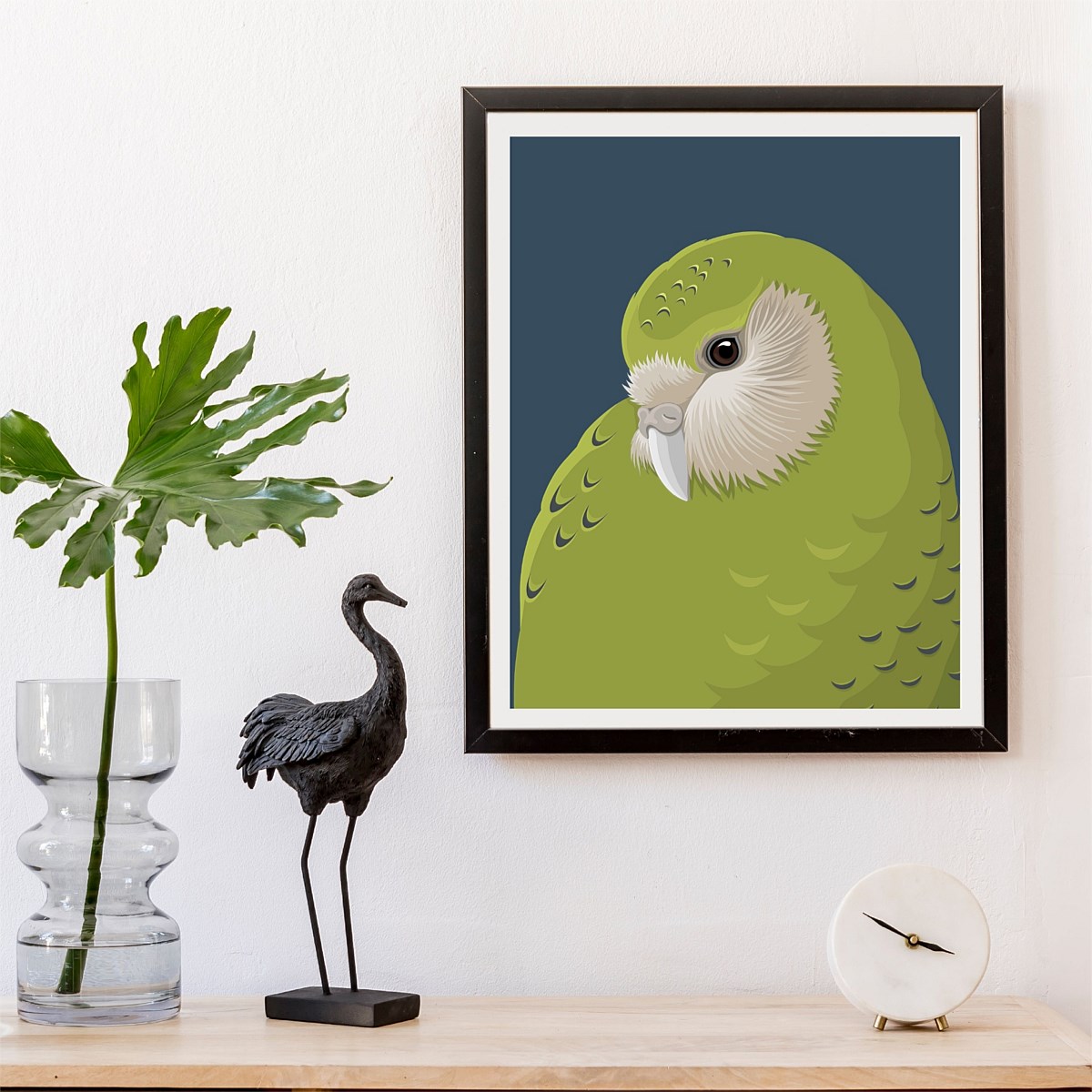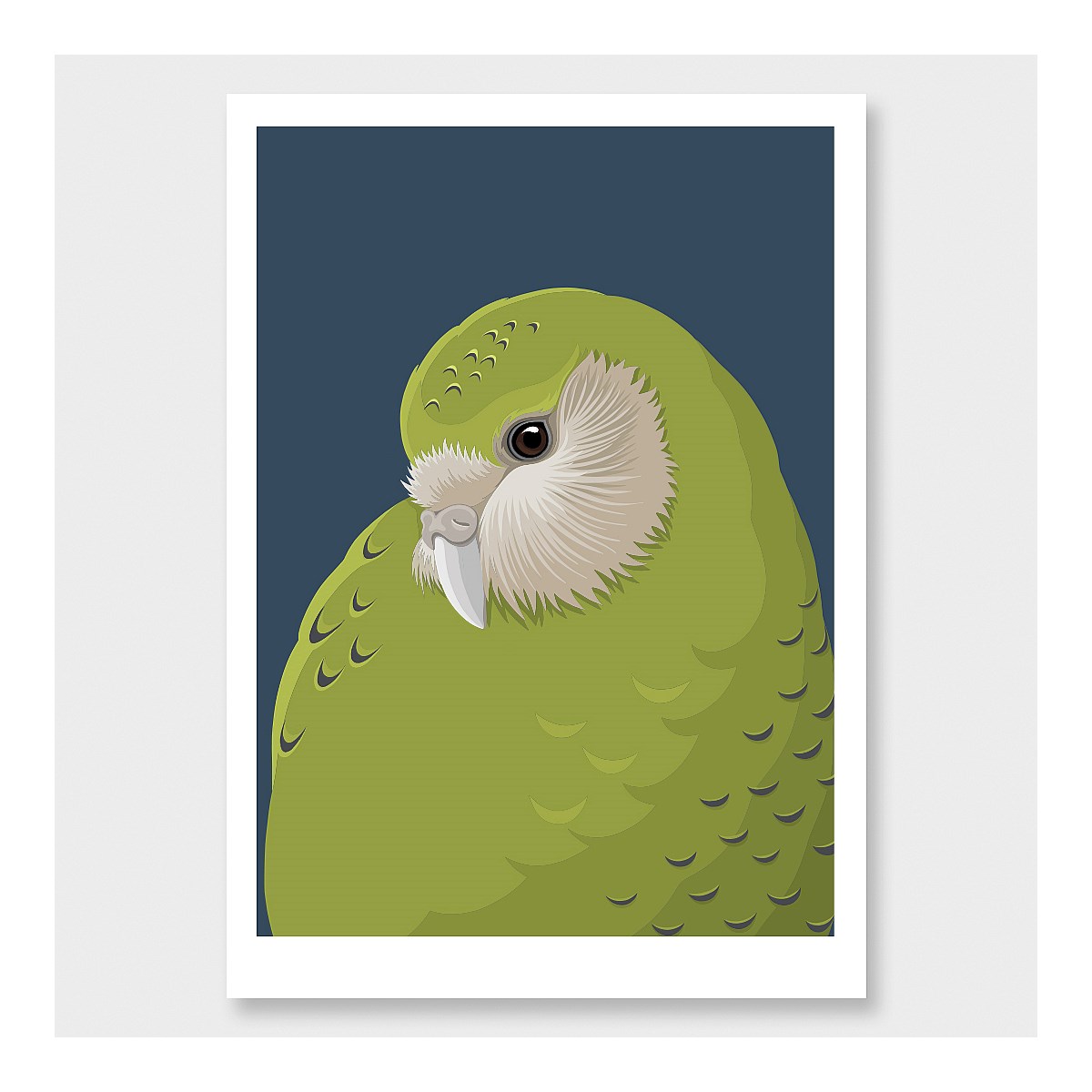 Created by local artist Cathy Hansby, drawn freehand using a digital tablet and desktop. Her modern style captures the personality of our unique wildlife, with bold colour and subtle detail. Cathy's art supports NZ Forest & Bird with their conservation work. The Kakapo image features lush green against a deep charcoal background.