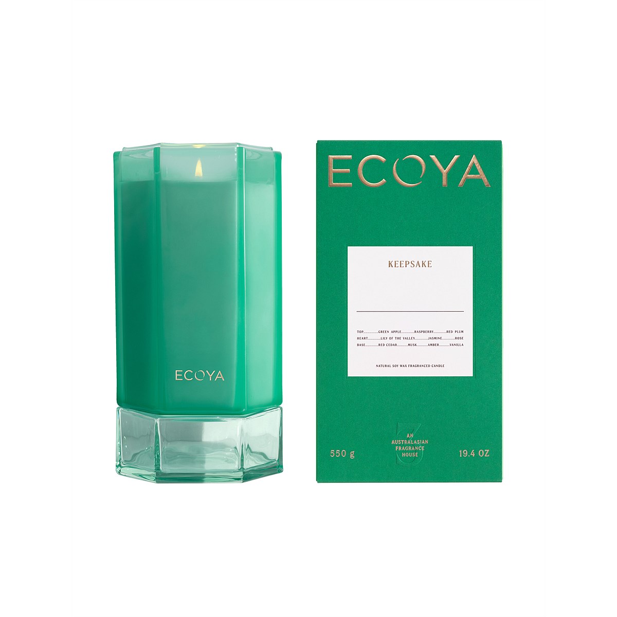 A fragrance to hold onto. Encased in a sculptural six-sided coloured cut glass jar, the Keepsake Candle is designed to be as timeless as the memories it evokes.