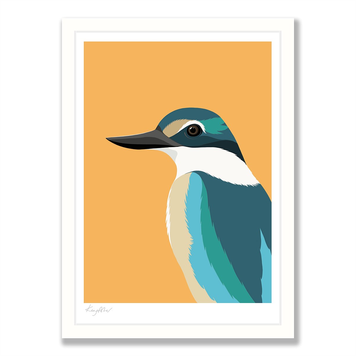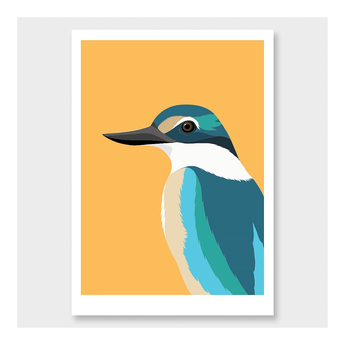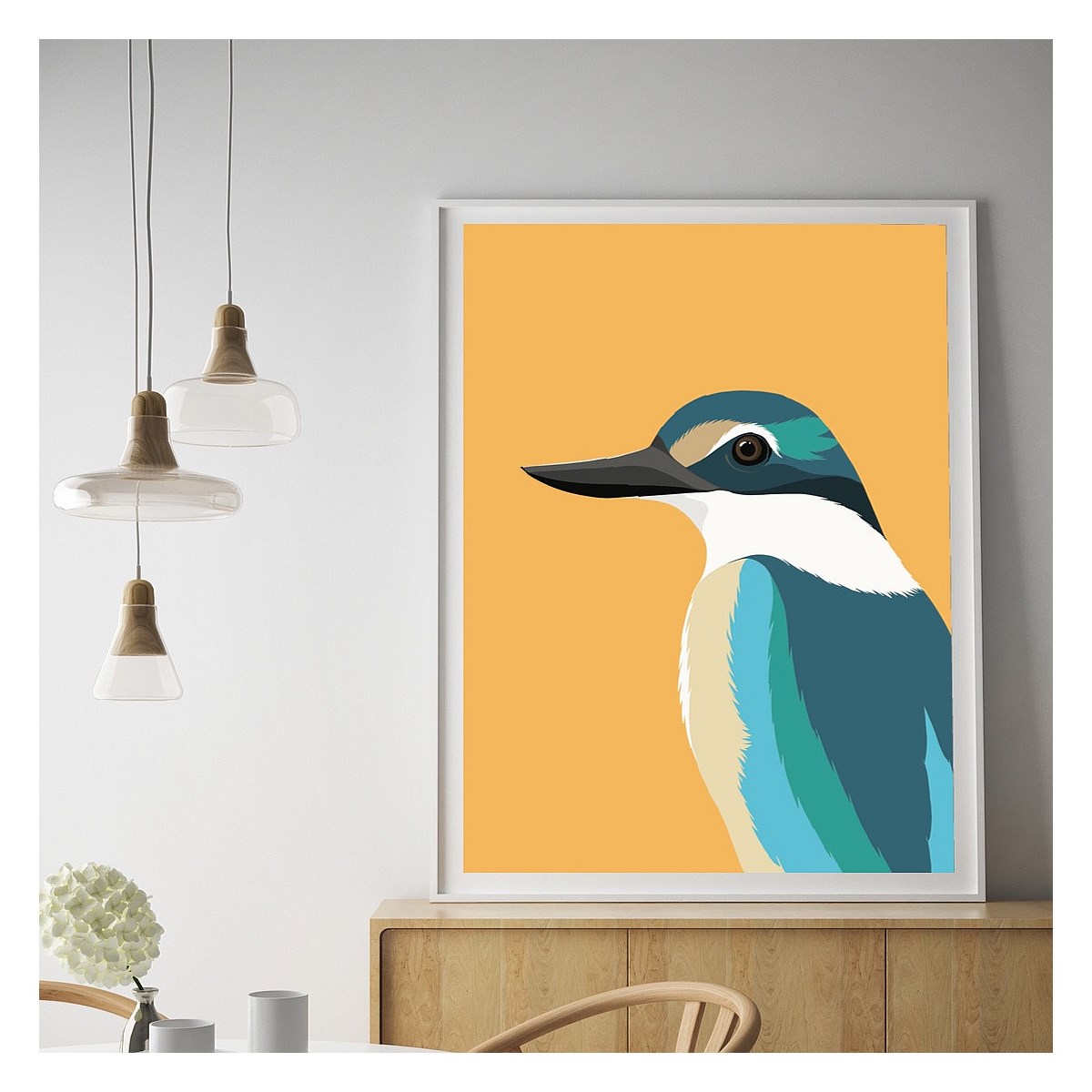 Created by local artist Cathy Hansby, drawn freehand using a digital tablet and desktop. Her modern style captures the personality of our unique wildlife, with bold colour and subtle detail. Cathy's art supports NZ Forest & Bird with their conservation work. The Kingfisher image features vibrant teal blues with warm yellow background. Each art print is printed to order, producing a high quality Giclee fine art print on smooth archival art paper. Giclee is one of the best reproduction methods available, using acid free paper and the latest archival inks. Prints have a lifespan over 100 years.