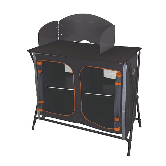 The Kiwi Camping Kitchen & Pantry has two generous zippable cupboards, an aluminium slat benchtop and a removable windshield to make camp cooking easy.