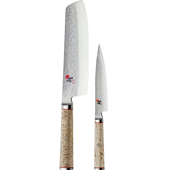 Miyabi Birchwood 5000MCD range combines the greatest in hardening technology, most precious knife materials and the artistry of traditional Japanese craftsmanship. The core of the SG2 super steel is protected by a 101-layer stunning flower Damascus patternCRYODUR® blade undergoes a four-step hardening process which maximises the properties of the steel. Traditional 3-step Honbazuke hand-honed edge. CRYODUR ice-hardened to 63 Rockwell. Stunning Birch handle features a striking mosaic pin, red spaces accents and a steel end cap. Manufactured in Seki, Japan. 13cm Shotoh Knife17cm Nakiri Knife.