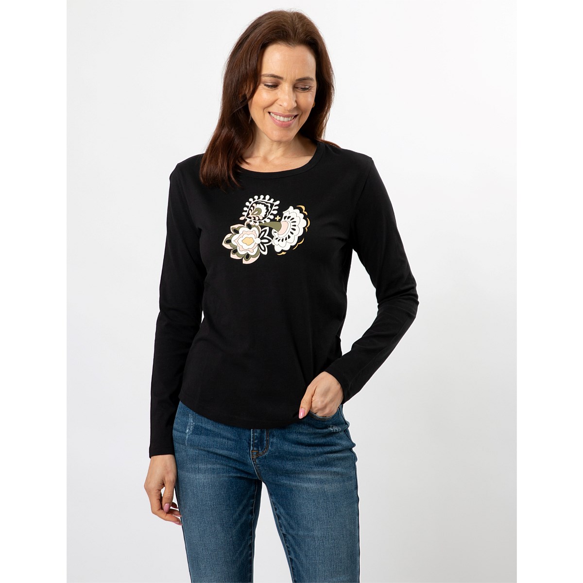 100% COTTON. Relaxed fit crew neck long sleeved t-shirt with a longer scoop back hemline.