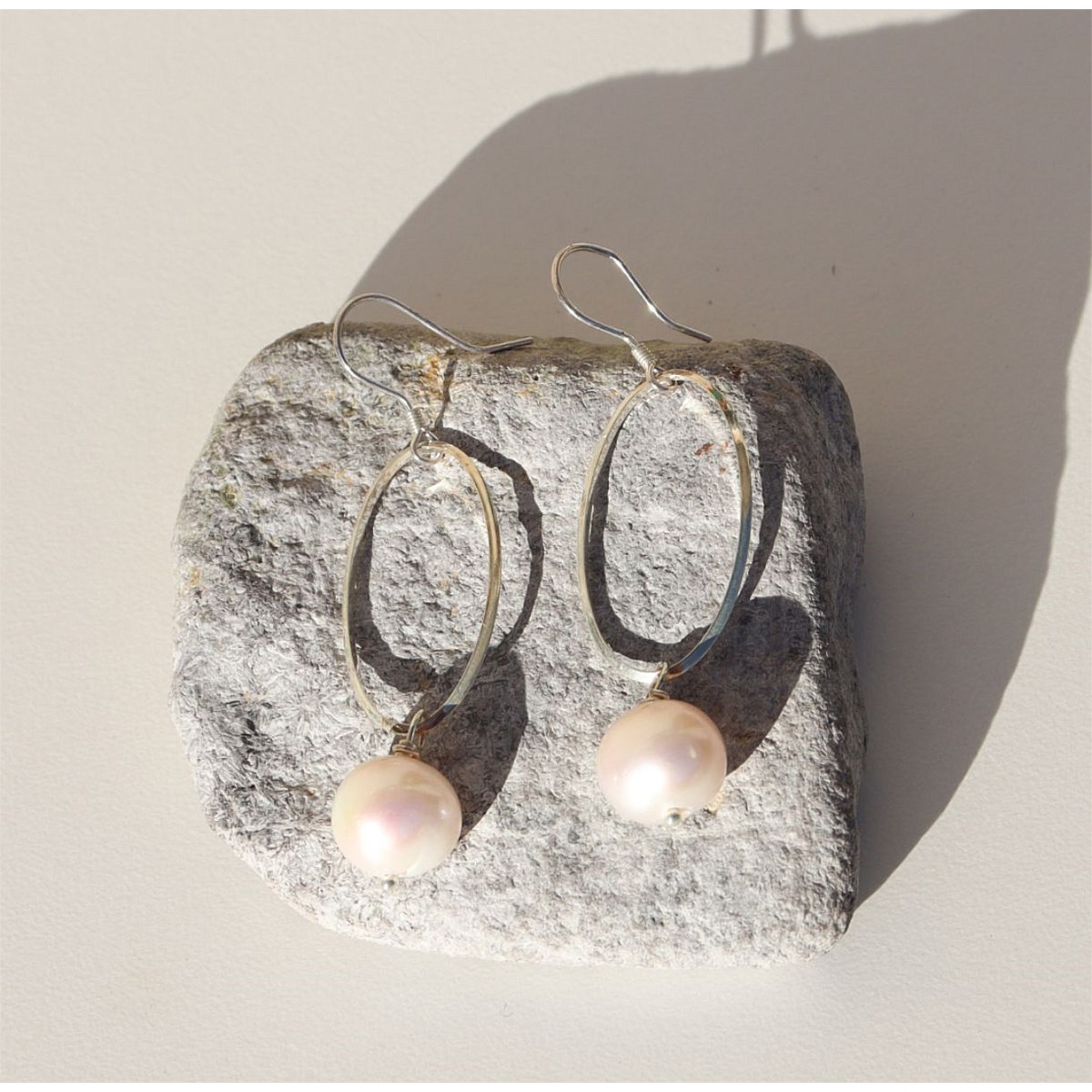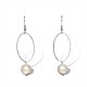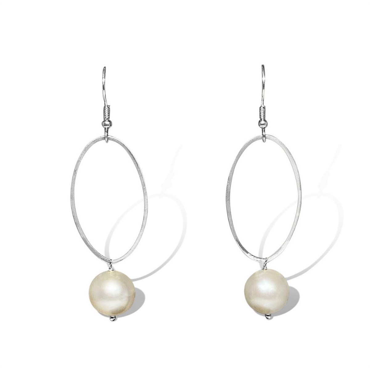 Hanging on a sterling silver hook style earring and sterling silver oval is a fresh water pearl. These earrings were designed to be modern, while the addition of the fresh water pearl ensures these earrings are timeless.
