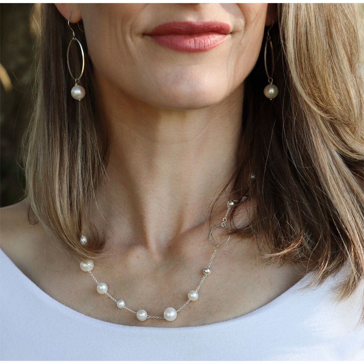 The fresh water pearl short necklace features the classic fresh water pearl in various sizes throughout the necklace. The timeless fresh water pearl has been paired with the sterling silver curb chain, silver circle features, as well as intermittent sterling silver beads. The total chain length is 50cm and comes with a 5cm extender chain.