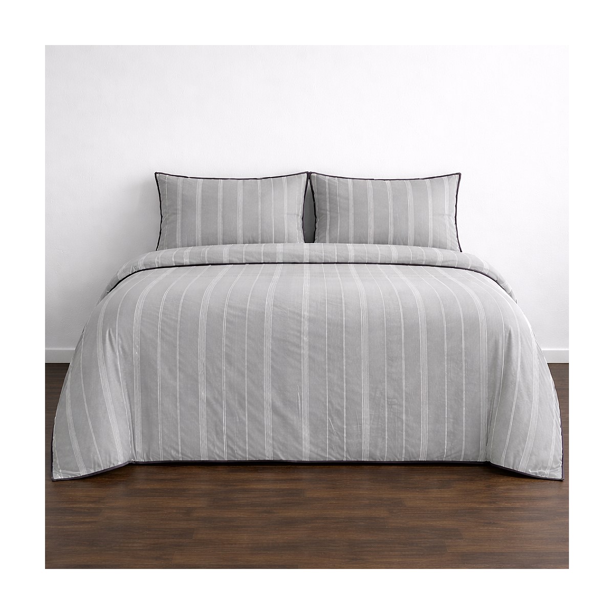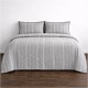 Lake House features a soft gray fabric with a subtle pattern of evenly spaced vertical white pinstripes. The stripes run the full length of the quilt, creating a clean, tailored look that feels both classic and relaxed. The neutral gray tone gives the bedding a calm, understated appearance that works well in a variety of bedroom styles, from modern to rustic. The quilt drapes smoothly over the bed with a gentle, natural fall along the sides, suggesting a lightweight yet cozy construction. Its edges are finished with a thin, dark piping that outlines the shape of the quilt and adds a refined contrast against the light gray fabric. This small detail enhances the overall design while maintaining the quilt?s minimalist aesthetic. 100% Cotton, Available in Grey and Taupe.