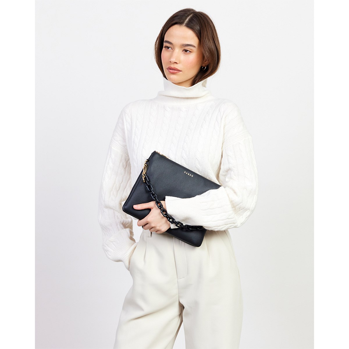 The detailed chain adds an elegant edge to her silhouette, while the versatile strap means you can wear her crossbody for hands-free ease or remove it entirely to carry her as a sleek clutch for evening. One bag, endless styling possibilities.