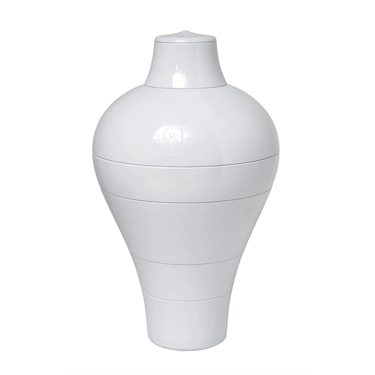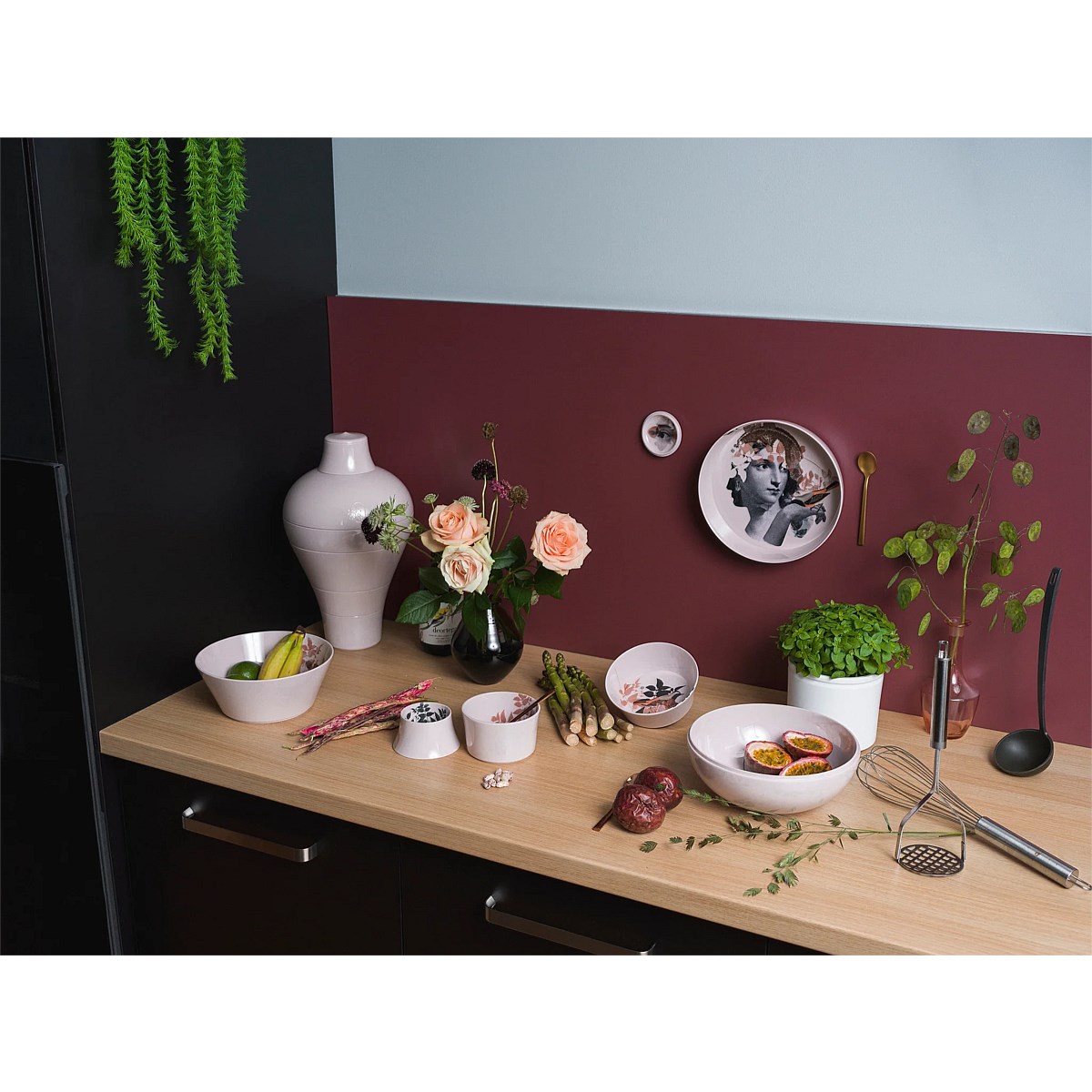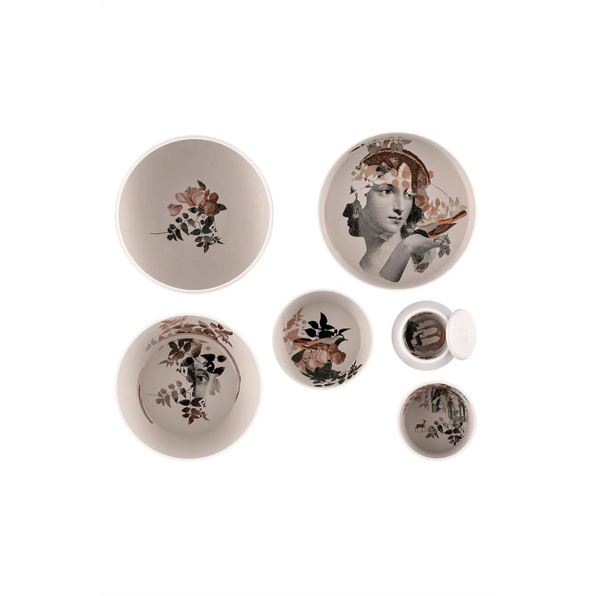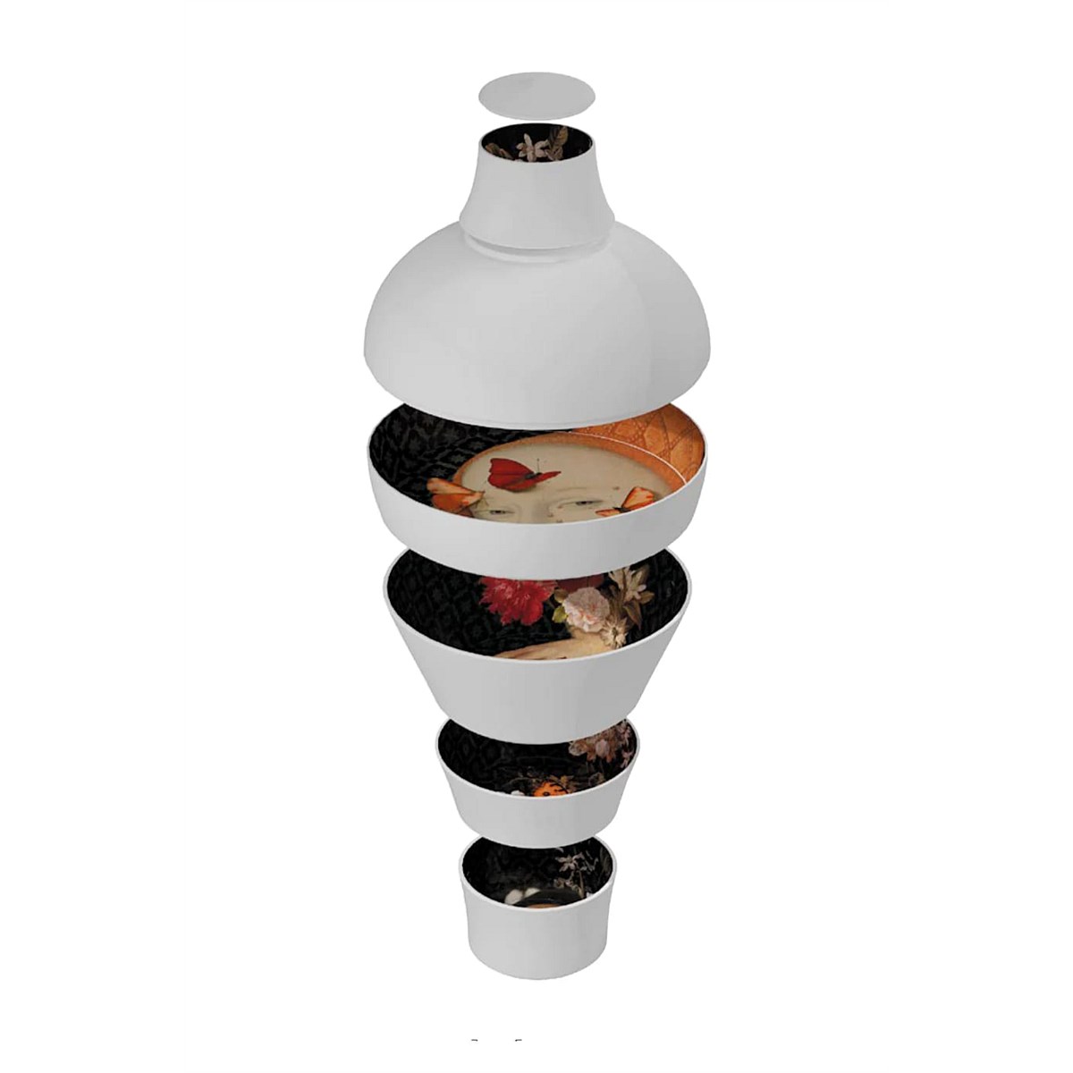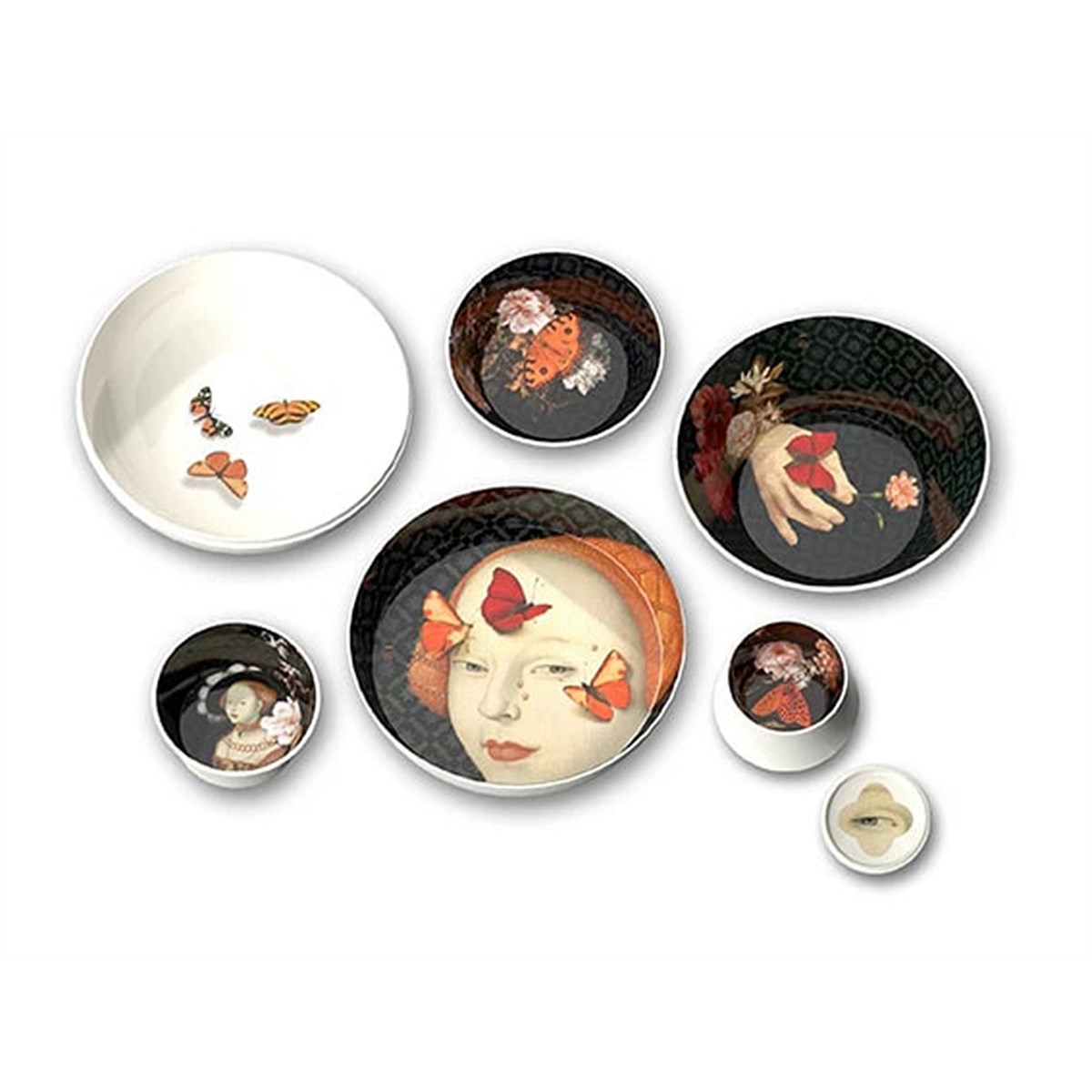Ming Blanc, a stacking of bowls and salad bowls for everyday use to serve small dishes and salads or to stage an aperitif's amuse-bouches, invites us to gradually plunge into the abyssal darkness of an oneiric aquatic universe, under the watchful and heady eye of a butterfly woman.