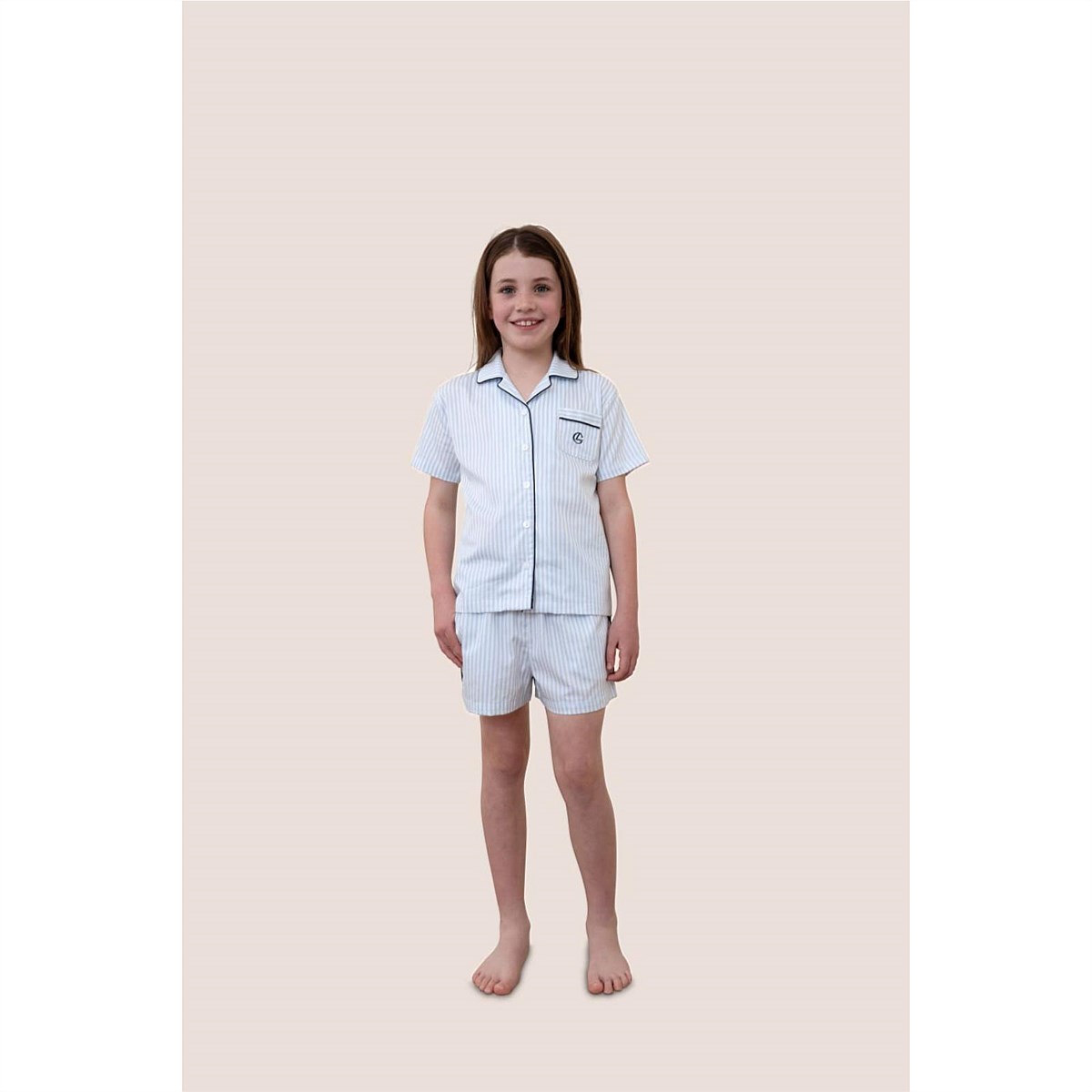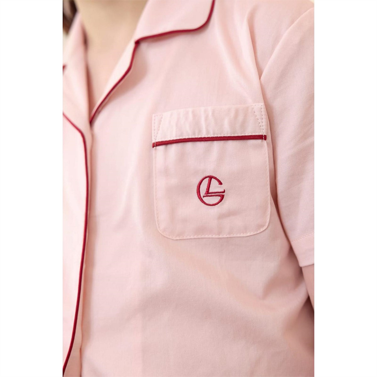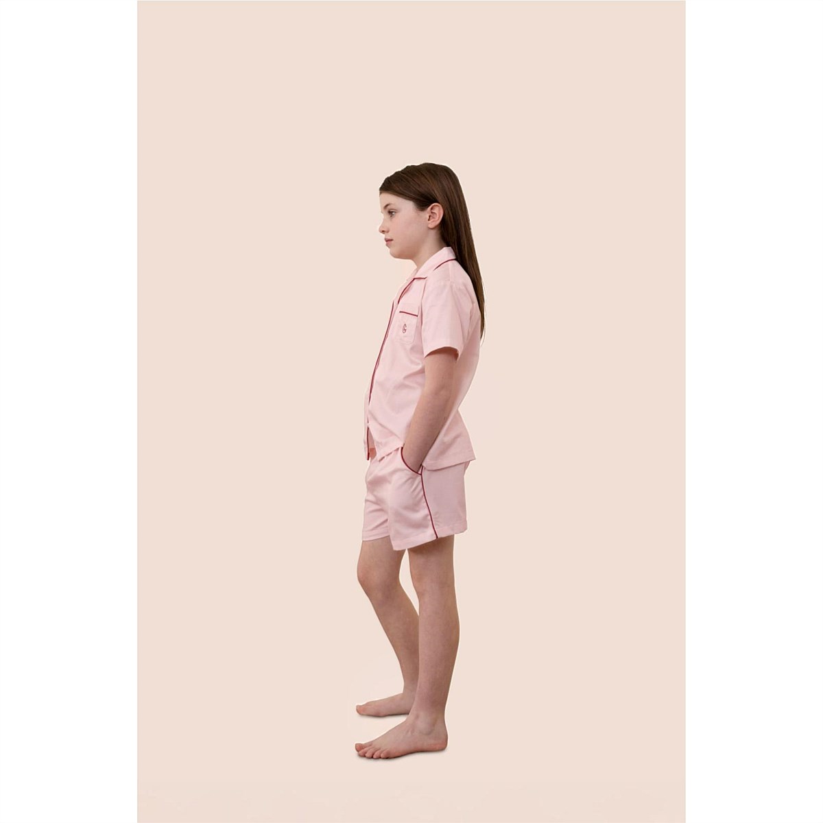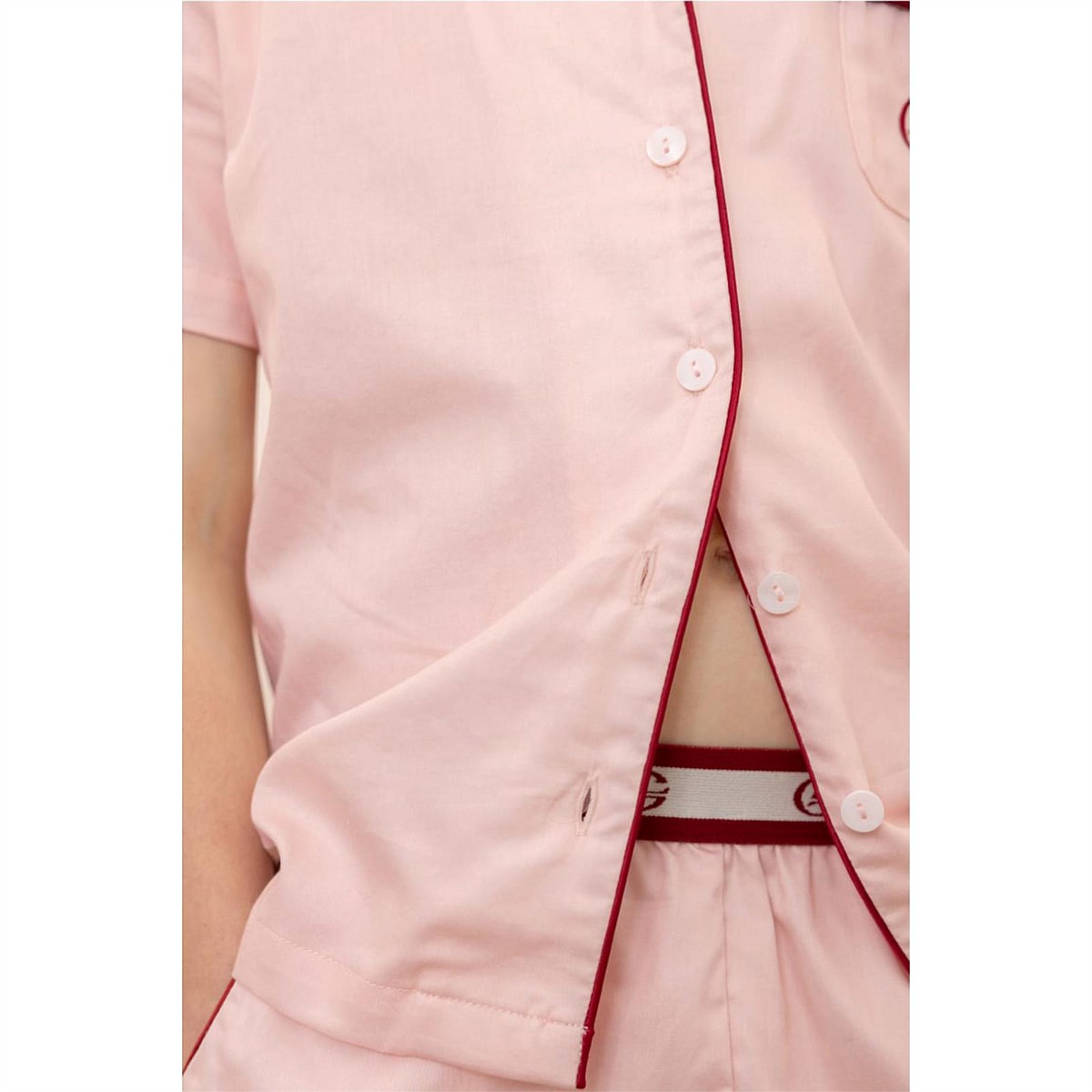 Top Style: Short sleeve, button-through, classic pyjama front, contrast piping