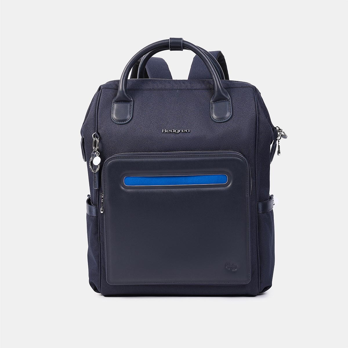 Is there anything the Moka L Backpack can’t do? This super stylish bag is minimalist in design but maximalist in function, with three exterior pockets and five interior pockets, plus a detachable pouch! The main compartment has an extra wide opening, so you can easily see where to organise your belongings, with spaces for your phone, laptop, tablet, keys, files and pens. There’s an Rfid pocket, a volume paper holder and space for your gym gear, so you can effortlessly negotiate the transition from the office to the gym. On the outside, you’ll find adjustable pockets for your bottle or umbrella. At 15.4”, this large backpack looks good too. Soft edges and a unique moulded front panel give it personality, while the recycled fabric means less waste. There’s a cute zipper charm and the typical Hedgren metal hardware, including locking zippers. The whole look is finished with the Hedgren signature logo.