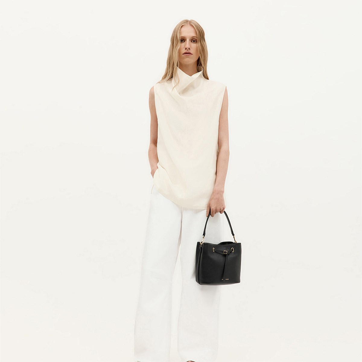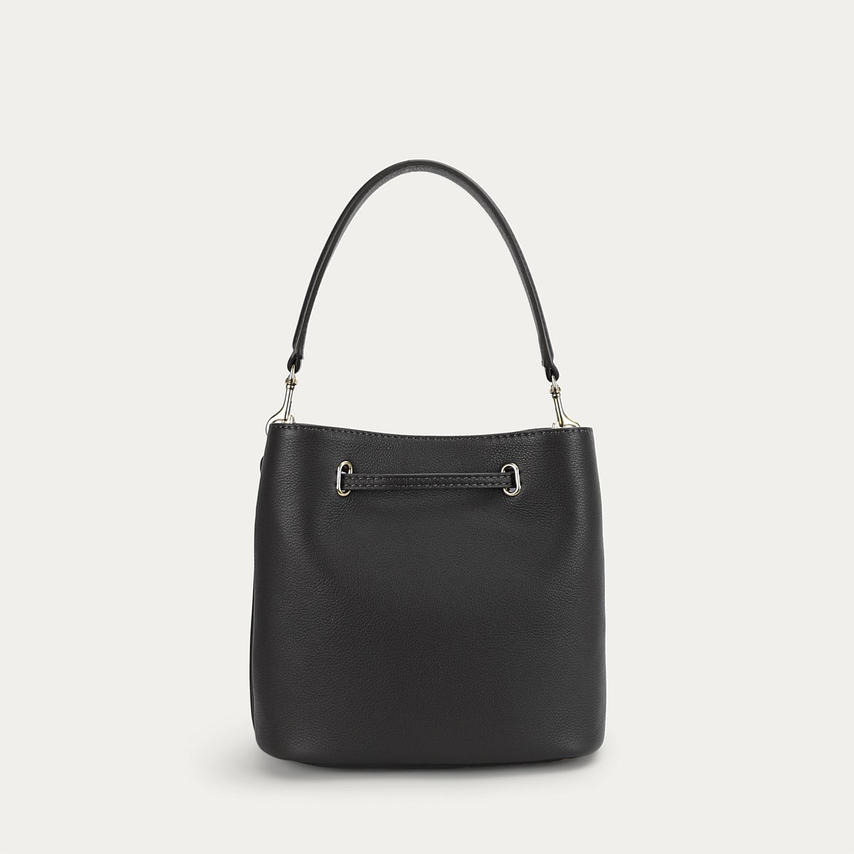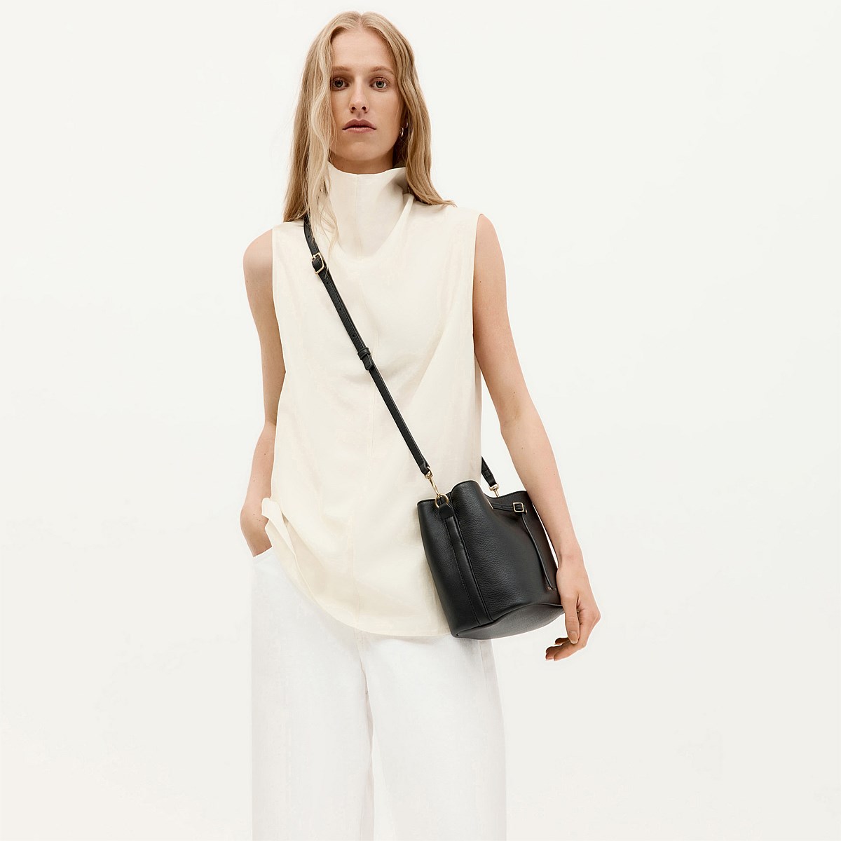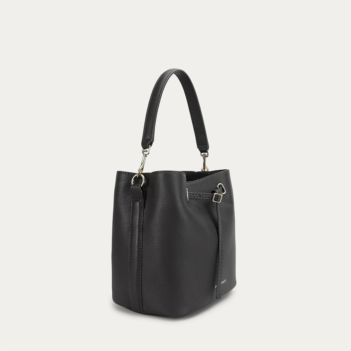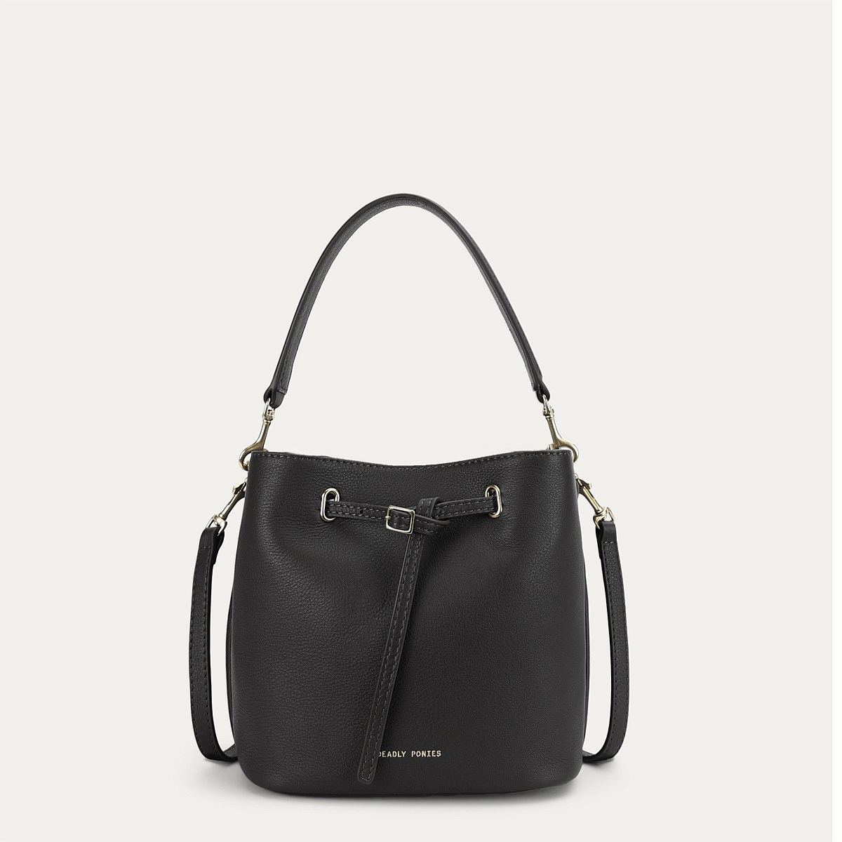 Mr Penny in Black reimagines the classic bucket bag in supple Calf Nappa, finished with solid brass hardware. He features leather detailing threaded through brass eyelets, a detachable top handle, an adjustable strap, and a removable cotton pouch.