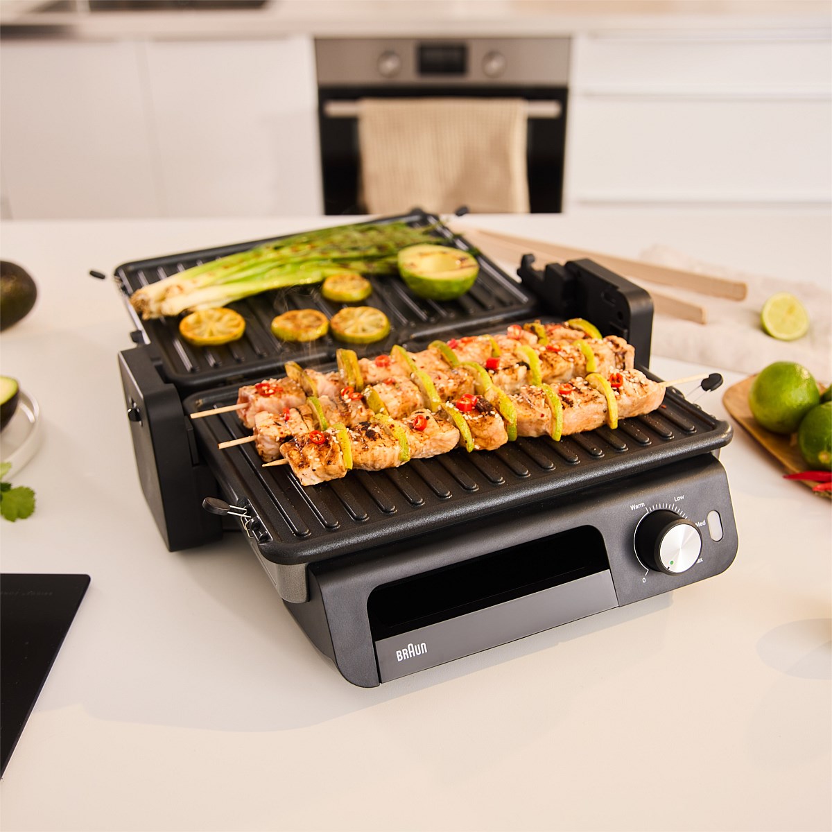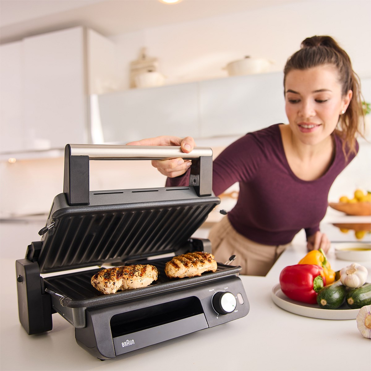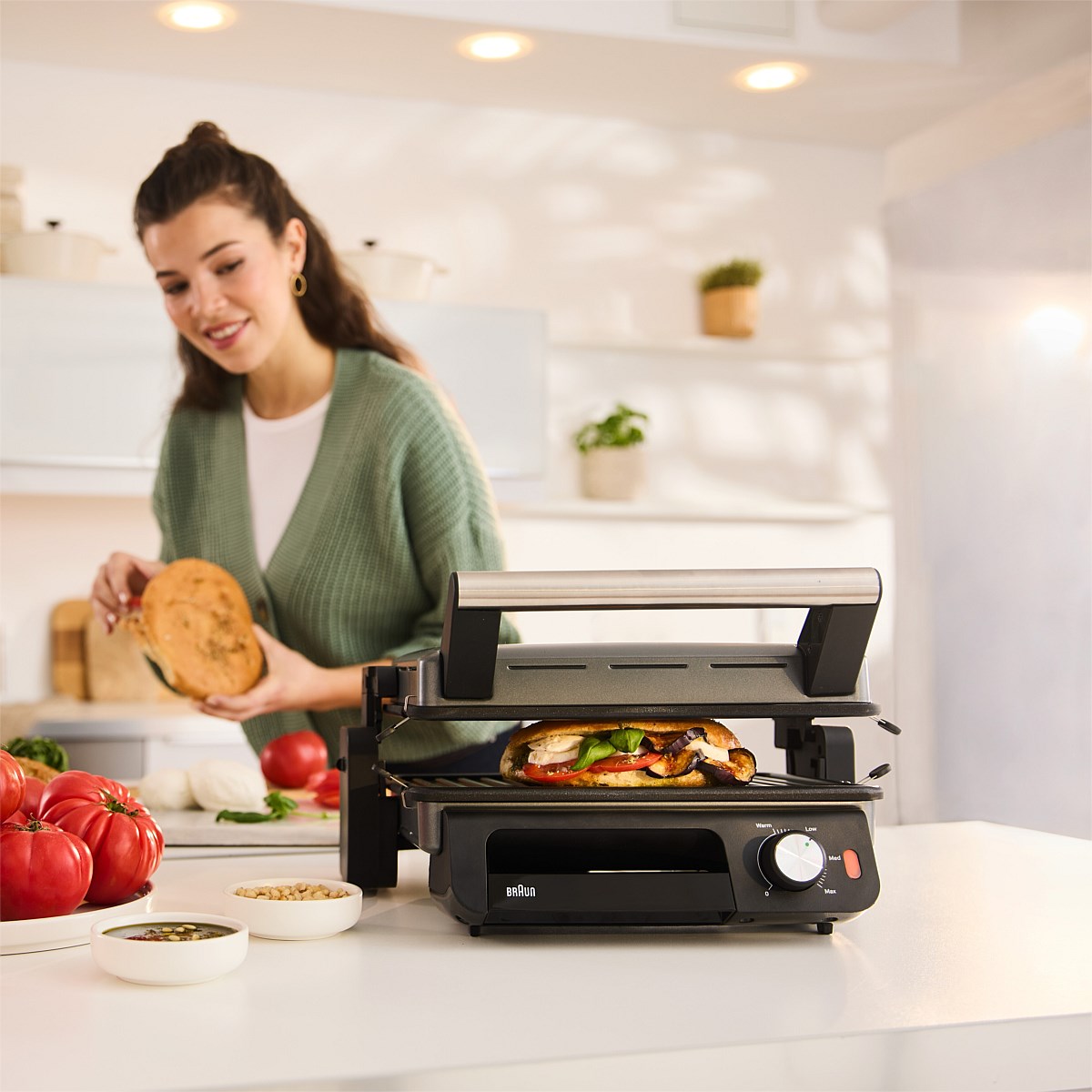 Enjoy easy grilling results for breakfast, lunch, dinner, and snacks with the new Braun MultiGrill 5. You'll love the versatility that our 3-in-1 cooking options give you. Veggies, meat, fish, or tasty bruschetta - you decide! The new MultiGrill 5 provides two cooking surfaces so you can create delicious, healthy meals quickly and without the guesswork. Take advantage of 2000 watts of power for quick heating and great grilling results. Plus, for extra space-saving in your kitchen, the grill is designed to be stored vertically in your cupboard.