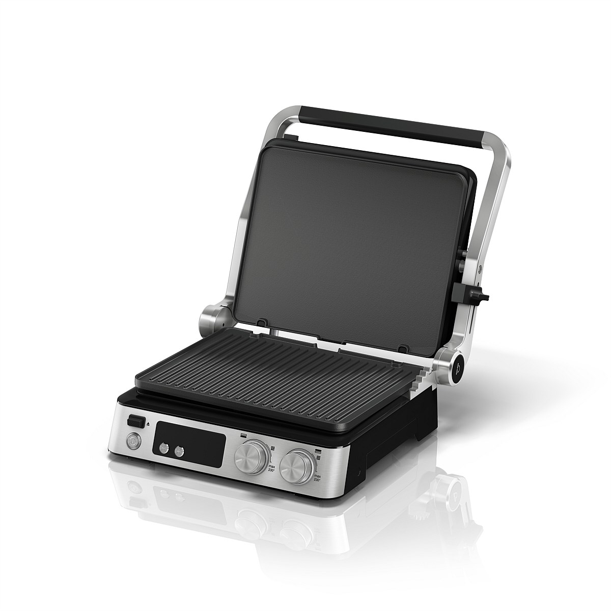 The grill option gently presses your food between the plates to minimise cooking time and evenly spread mouth-watering grilled flavour on both sides of your food. Use the open option and you'll get that BBQ flair with two open cooking surfaces for maximum versatility. And there's also the oven option, for grilling delicate food from both sides without upper plate contact.