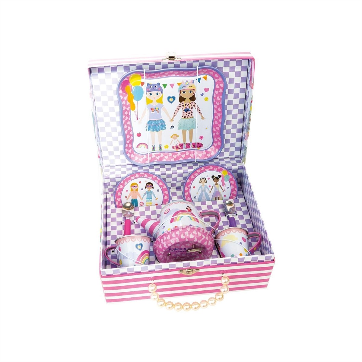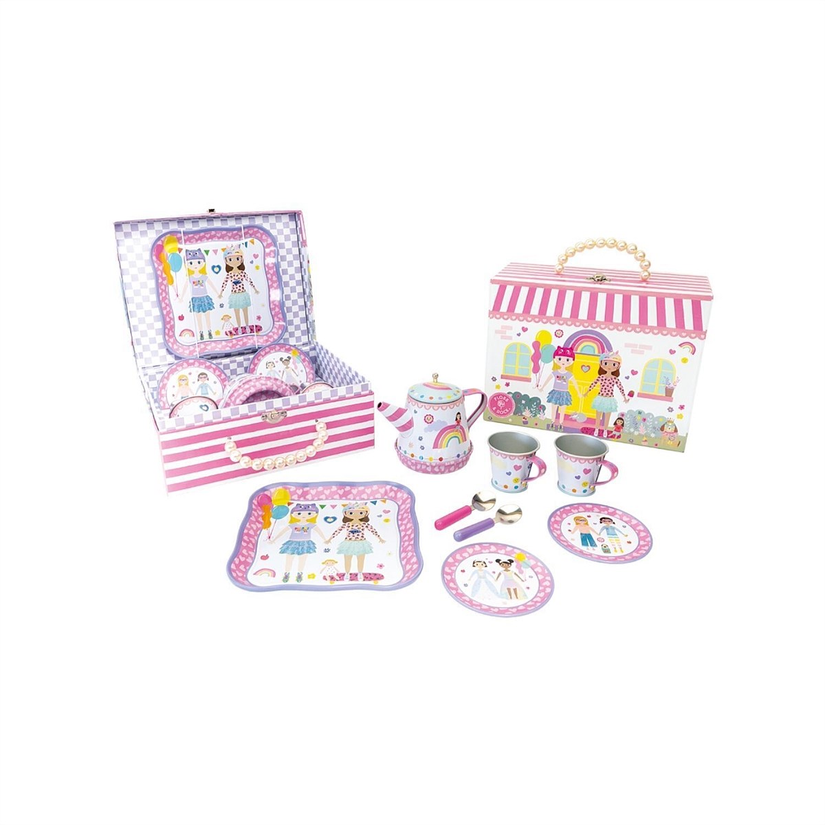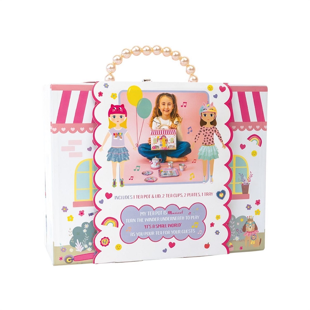 Our beautiful 9-piece Musical Best Friends Tea Set has a tea pot and lid, 2 tea cups, 2 plates and 1 tray in a gorgeous reusable carry case complete with pretty pearl handle, perfect for taking to tea parties with friends!