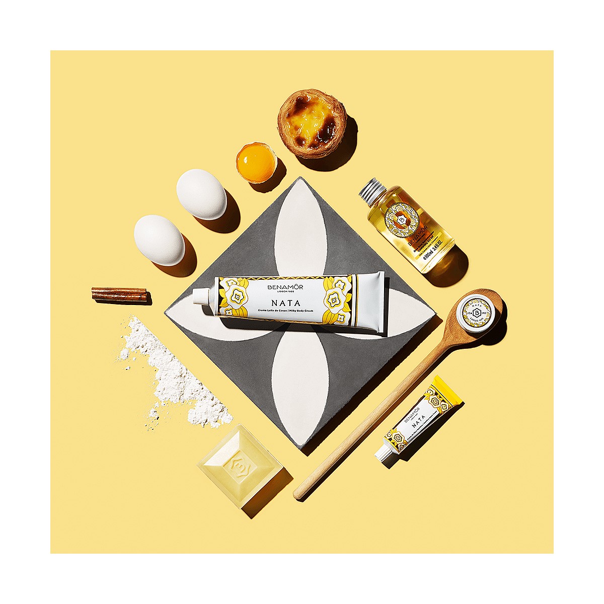 This luxurious collection is pure indulgence with four textures: Body Cream 150ml, Dry Oil 100ml, Hand Cream 50ml, Soap 100g. The Nata collection is inspired by the magnificent Portuguese custard tart, a delicacy in Benamor's home city of Lisbon, Portugal. Give your body a treat with our delicious Nata Milky Body Cream 150ml. Blended with antioxidants, this cr?me de la cr?me of body creams comforts and hydrates your skin, leaving it soft and smooth. Our Nata Miracle Dry Oil 100ml is a unique blend of carefully hand picked cinnamon, natural argan oil and natural sweet almond oil. Apply a few drops of this nourishing and delicately scented oil on your hair and body for silky-soft, radiant and healthier looking skin and hair.? Wash your hands and body with Nata Soap 100g and be surprised by its gentleness.? Follow it with Nata Hand Cream 50ml to nourish hands leaving them deliciously soft and perfumed. Normal to dry skin.