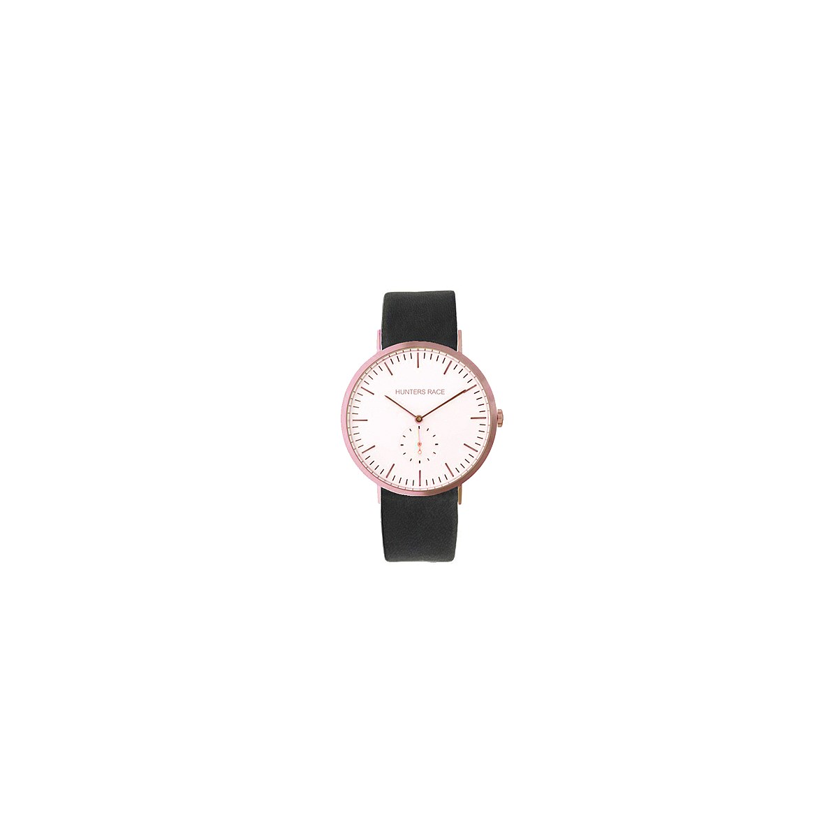 FEATURES - 41mm IP rose-gold stainless steel? case, White dial with rose-gold index, Silver-white seconds hand sub-dial, Genuine black leather 'slide through strap', Stainless steel IP rose-gold buckle, Sapphire crystal scratch-proof glass, High precision Miyota IL45 quartz movement, Water resistant to 3 ATM (rain resistant), Beautiful gift-box packaging, 5 year Hunters Race warranty