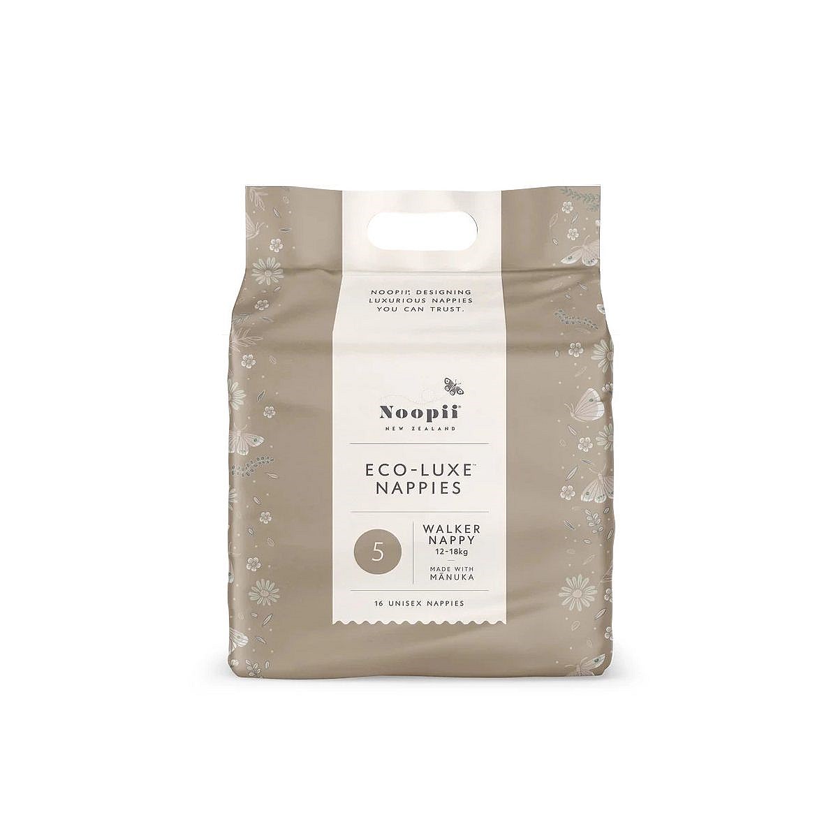 Noopii Walker Nappies are suitable for little ones in the 12?18 kilogram weight range, with each pack containing 16 unisex nappies.