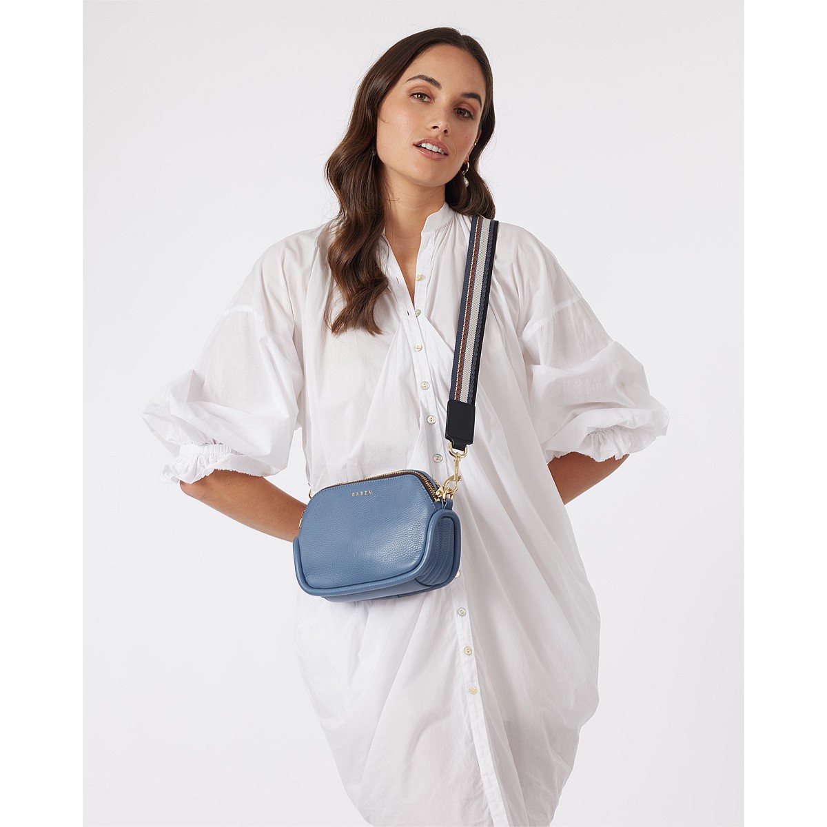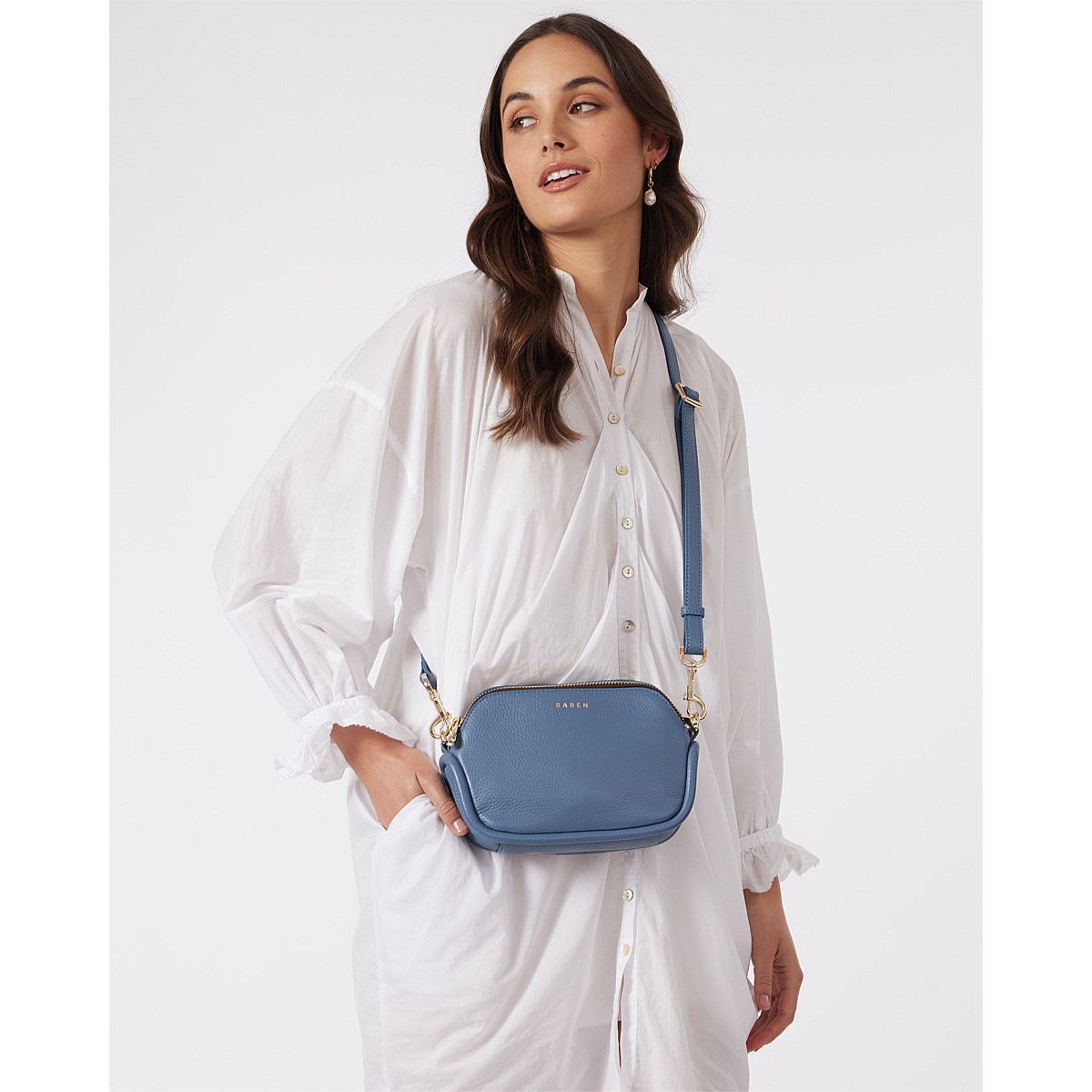Details: Detachable and adjustable long leather strap to be worn over the shoulder or across the body; two interior secure zip compartments; one internal drop pocket; gold plated hardware; interior secure zip pocket; zip closure.