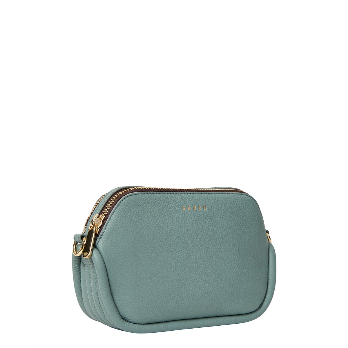 Details: Detachable and adjustable long leather strap to be worn over the shoulder or across the body; two interior secure zip compartments; one internal drop pocket; gold plated hardware; interior secure zip pocket; zip closure.