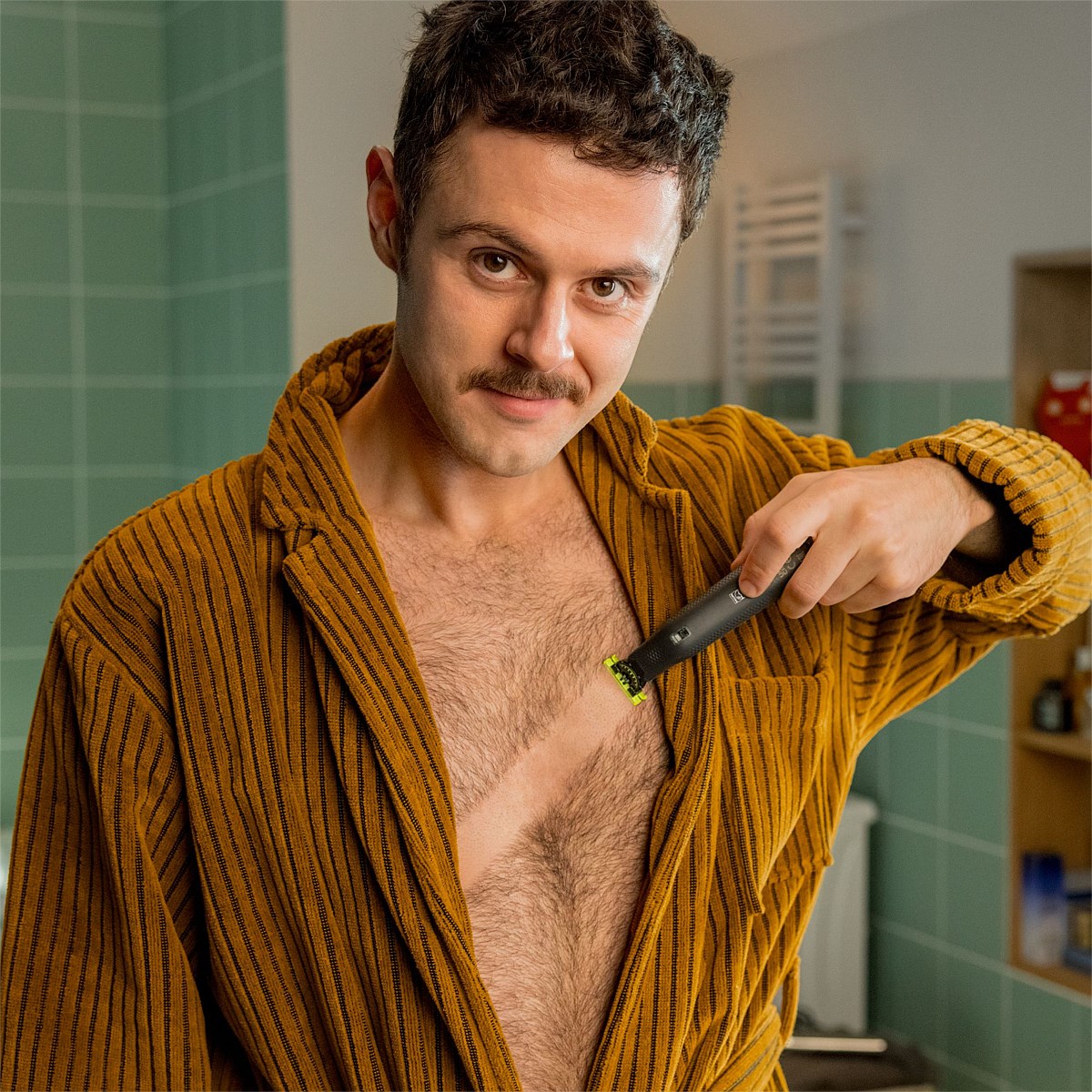 Philips OneBlade Pro Face + Body trims, edges and shaves any length of hair. You get a blade for your face, and one with a skin guard for your body. Forget about using multiple tools. OneBlade does it all.