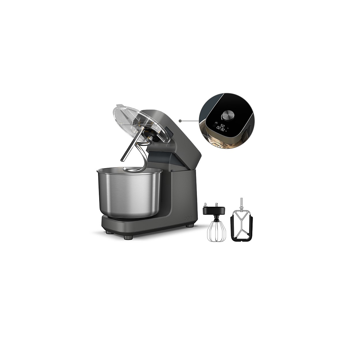 The Ooni Halo Pro Spiral Mixer is a revolution in mixing. It uses dual-kneading spiral mixing technology usually only found in professional kitchens. And, it’s small enough to fit neatly on a kitchen counter, so you can make bakery and pizzeria-quality dough at home.Spiral mixing technology helps to form a stronger gluten network, which delivers stronger dough, puffier crusts, plus better texture and taste. While the Ooni Halo Pro looks great, it’s still an essential kitchen tool, designed to be used every day. That’s why it has dependability built in – from its silicone feet to its stylish, anti-fingerprint glass-covered head. The Halo Pro’s intuitive control center lets you calibrate the settings to match a recipe precisely. And, with just a simple turn of the ergonomic dial, you’re up and running. Thanks to the high-capacity bowl and versatile attachments, Ooni Halo Pro really will help you to bake better at home – from pizza and bread to cakes, cookies and beyond.