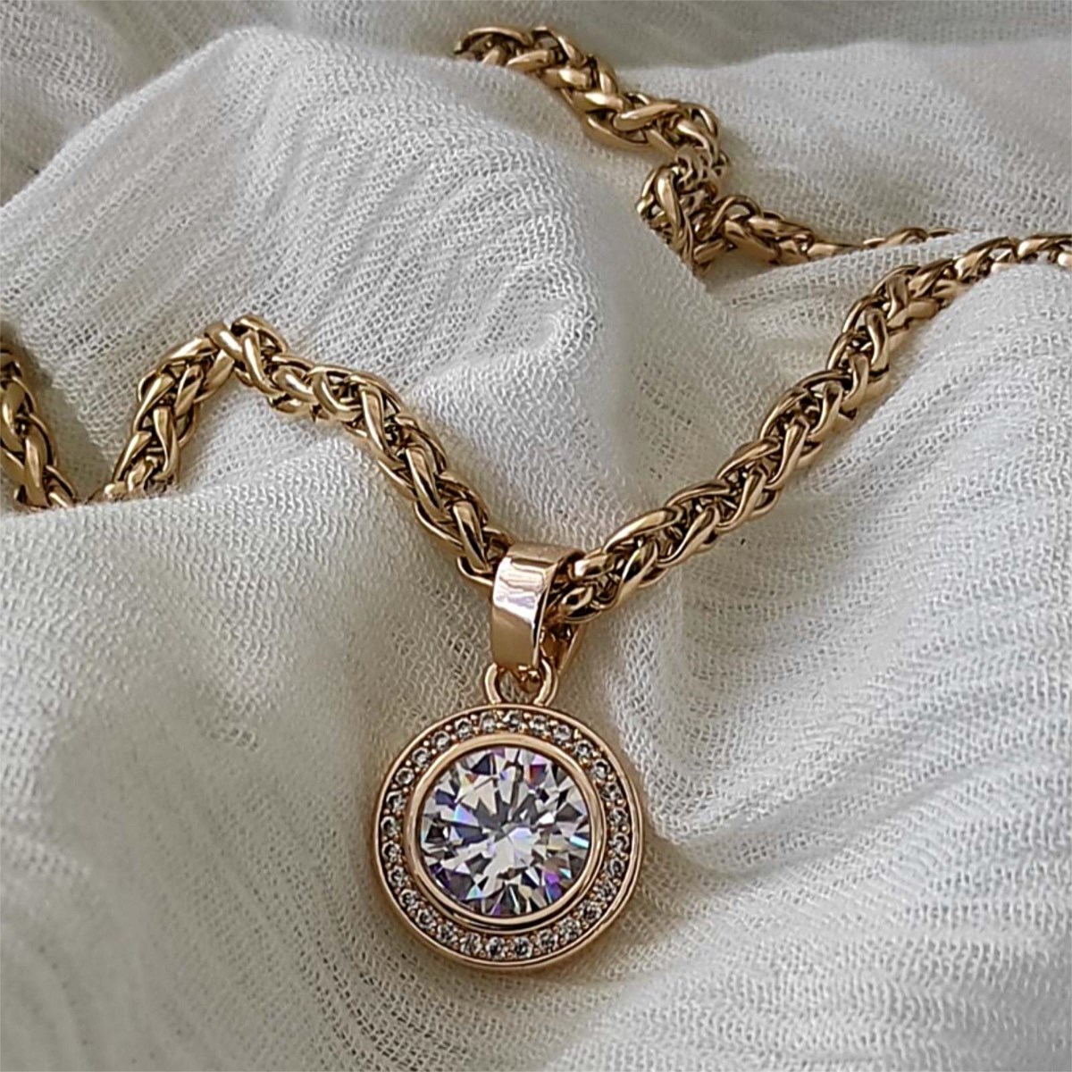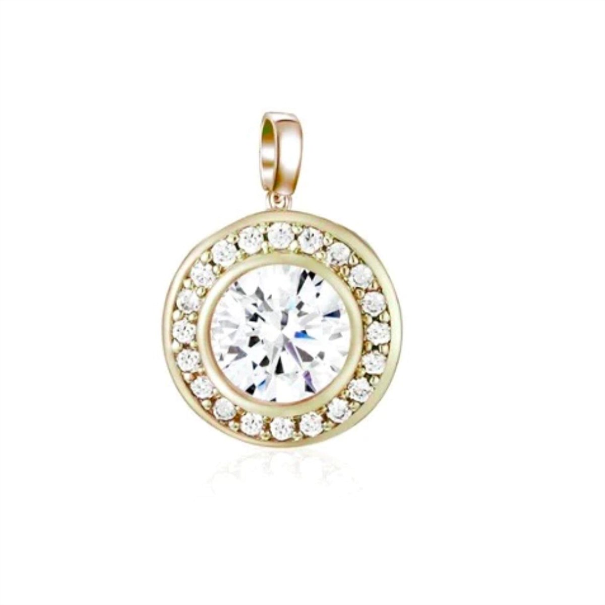 Kagi's Gold Orbit Pendant, features a gold cased cubic zirconia, in a circle of clear cubic zirconia. Simply hook onto your Kagi's Rose Gold chain necklace or Kagi's petite Helix bracelet and you are good to go! Size: 15mm diameter