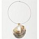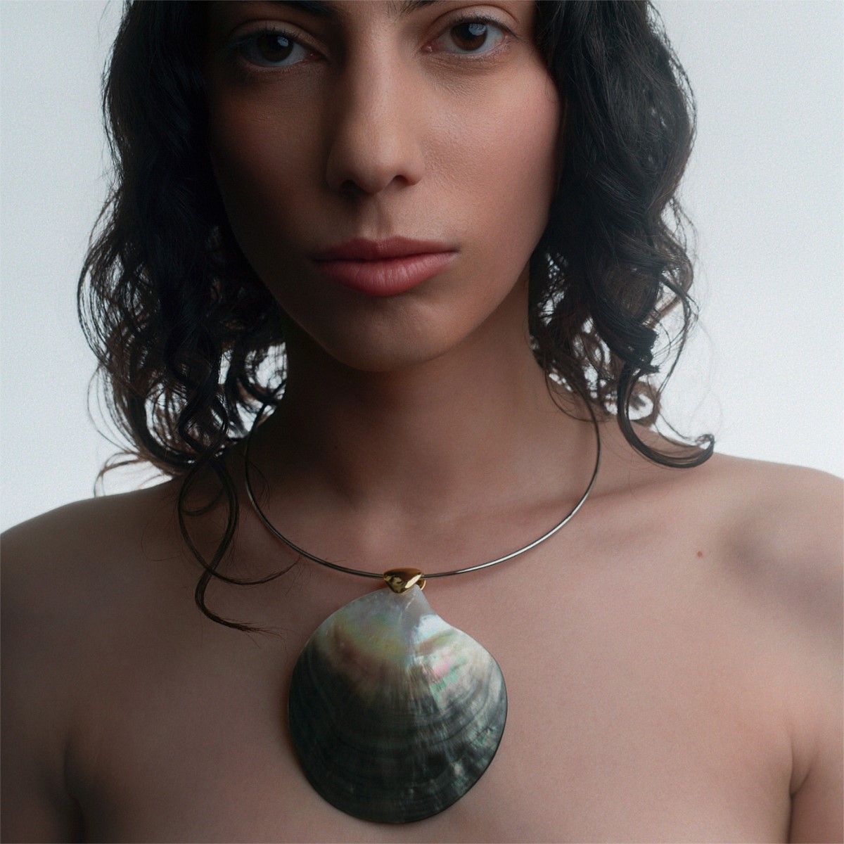 A generously sized black mother of pearl shell is linked to a sterling silver collar by a sculpted gold clasp. The tension between the size of the shell and the delicacy of the collar gives this necklace its dynamism.