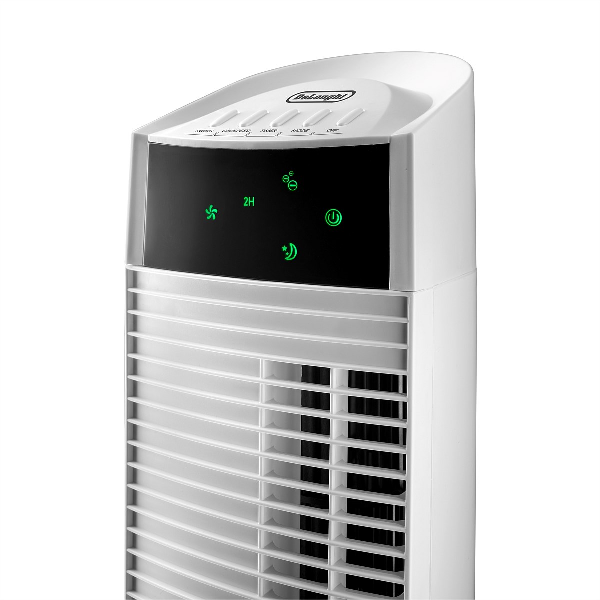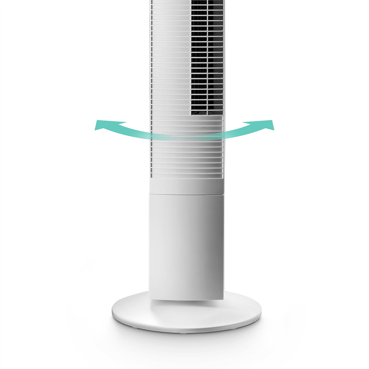 This sleek white oscillating tower fan is an elegant solution for instant, evenly distributed cooling.