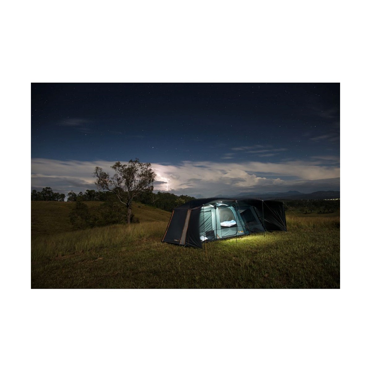 The Fast Frame BlockOut Lumos 10P Tent is a spacious 3-room family tent packed with features, making it ideal for large families. Featuring the Fast Frame® system, this tent can be set up without hassle in minutes and boasts a triple hub design, providing extra space inside and plenty of durability. The large gusseted windows offer excellent airflow, reduce condensation, and can be pegged out in bad weather while still providing ventilation. The BlockOut® coating on the fly helps regulate temperature by reducing heat by up to 10 degrees and blocks out up to 95% of light for afternoon naps or sleep-ins. The integrated Lumos™ light system in each room allows for customised, fuss-free zoned lighting and can be easily dimmed to balance run time and light output. The fly is constructed with heavy-duty 150D Ripstop® material and features a 3000mm water head rating for maximum weather protection, along with an ultra-tough PVC-backed polyoxford floor to withstand tough terrain. The inner tent features No-See-Um Mesh panels for ventilation and insect protection, along with zippered screens to provide privacy at busy campsites. A full-sized front awning with adjustable side panels along with rear and side awnings provides maximum shade and living space. There are plenty of storage pockets throughout the tent, including a 6-panel storage system for your phone, wallet, keys, and even a midnight snack, along with a PVC pouch to hold an iPad for watching movies. A zippered PowerPort™ entry allows easy cable access, and a rear zippered port accommodates heaters and air conditioners. When it's time to pack up, this tent packs down just as quickly as it sets up and can be stored in the oversized heavy-duty 600D carry bag with expandable gussets to ensure easy packing.
